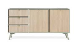 Möbelkollektionen Forest är en perfekt kombination av natur och modernitet tack vare användningen av nyanser av beige och eukalyptus och fronter med scandi fiskbensmotiv. Möbeln är gjord av högkvalitativ laminerad skiva, vilket gör den reptålig. Träben som är monterade något i vinkel ger möblerna charm. Guldfärgade aluminiumhandtag matchar perfekt scandi fiskbensfronter. Kollektionen passar både vardagsrummet och sovrummet. Setet innehåller byråer, tv-skåp, en bokhylla och ett sängbord.