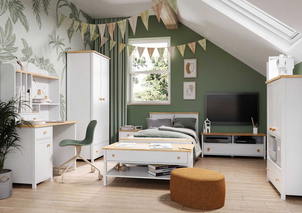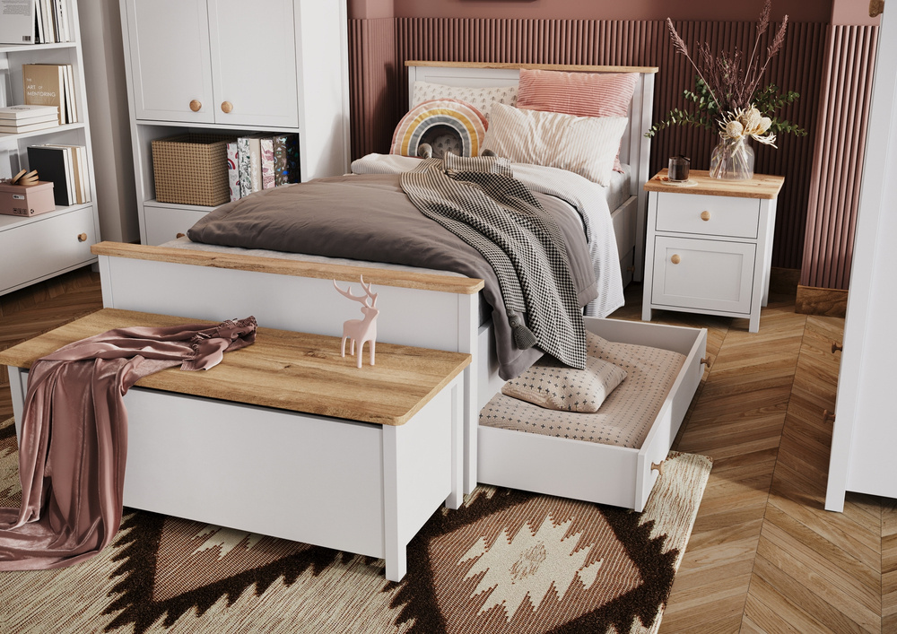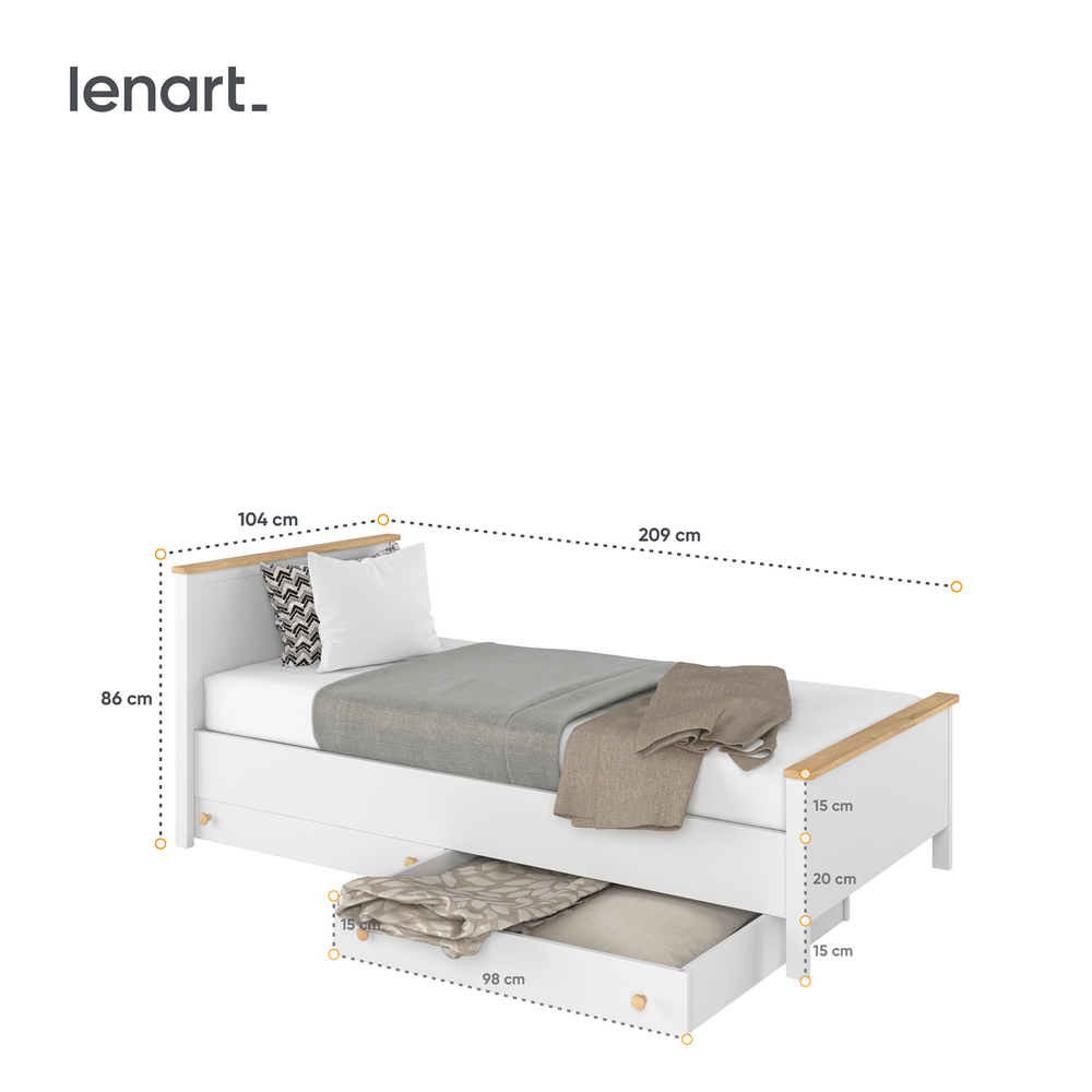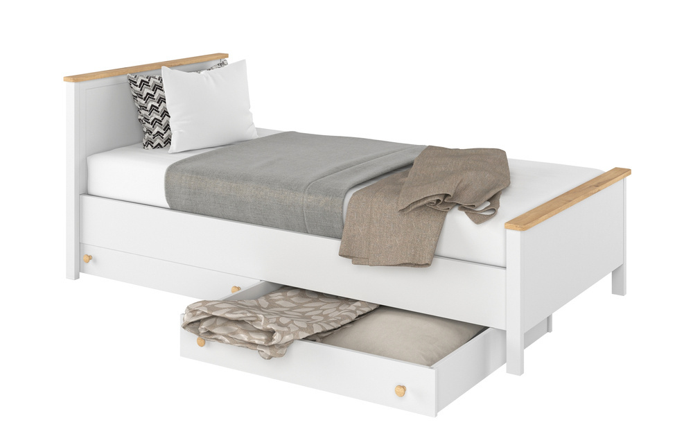 Ta hand om ditt barn och välj en bekväm STORY-säng som ger honom sovkomfort och avkoppling. Vår produkt imponerar inte bara med sin funktionalitet, utan också med sin moderna design. Klassisk färgning, en extra vit sänggavel för ryggstödet och stabila ben harmonierar perfekt med ungdoms- och barnrum. Fjädrande madrassen och den tåliga konstruktionen ser till att ditt barn kan ligga bekvämt och leka bekymmersfritt. Du kan utrusta produkten med en rymlig låda från samma kollektion, som gör att du kan gömma ett extra täcke, filt eller leksaker.