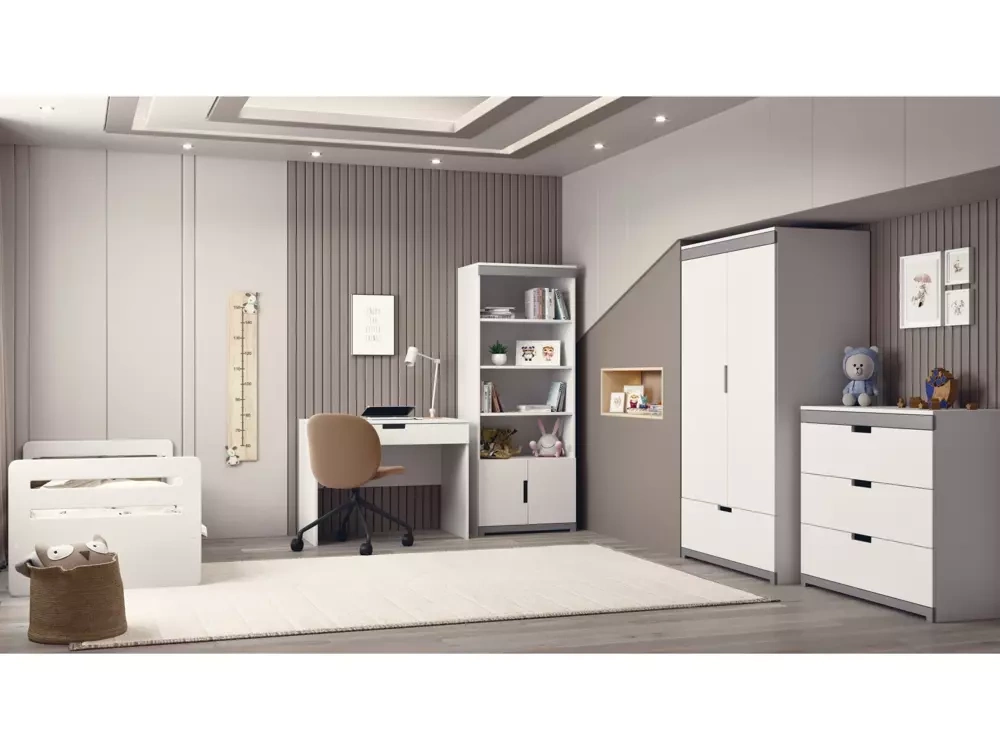 Skapa ett drömrum för ett barn! Det moderna TOMI-setet i klassisk stil tillhör en serie som är ett ledande erbjudande inom kategorin möbler för ett barnrum, kännetecknat av en elegant i sin enkelhet design av kropparna. Tack vare sin design är Tomi en idealisk lösning för både mindre och rymliga interiörer. Setet kännetecknas av en solid konstruktion, vilket garanterar hållbarhet och säkerhet vid användning. Den presenterade möbeluppsättningen gjordes i en klassisk stil, vilket gör den perfekt för alla barnrum på grund av sin moderna design och minimalism på samma gång. MDF-skivornas fronter har målats tre gånger med certifierad organisk färg.
