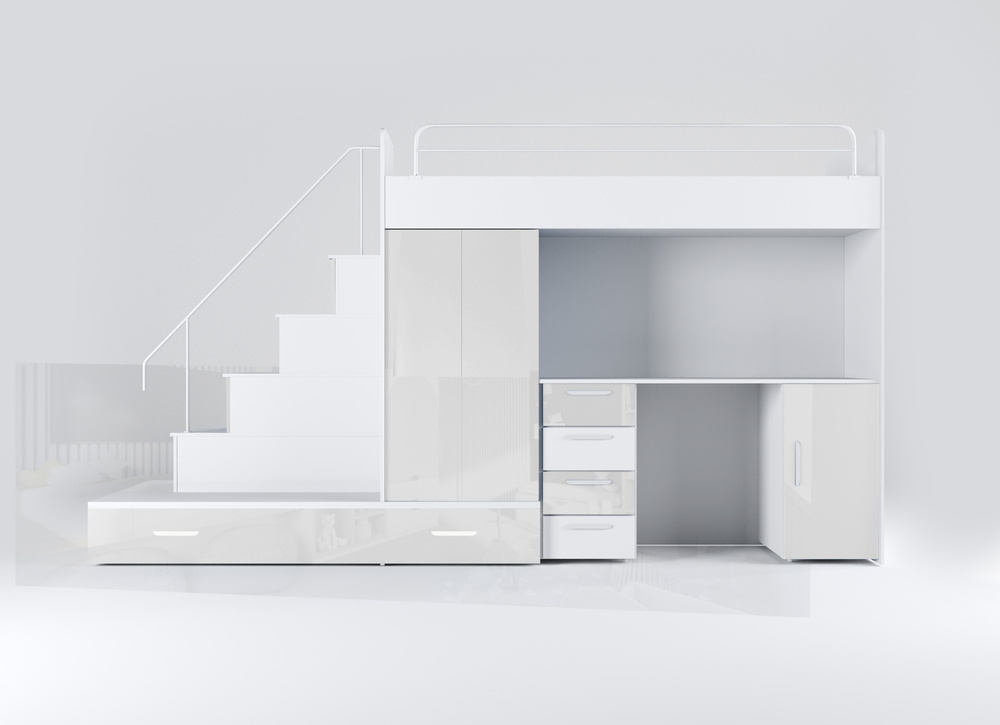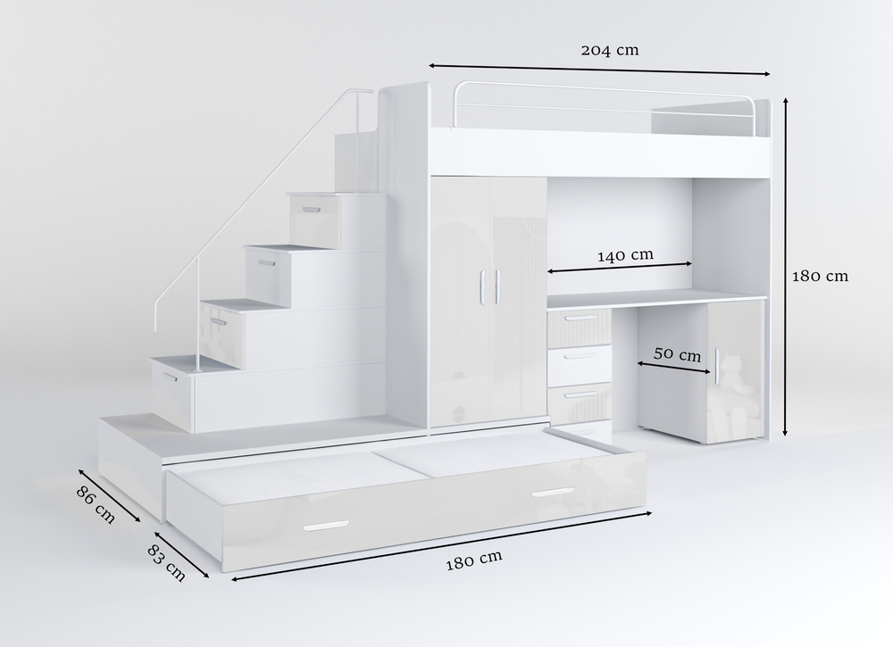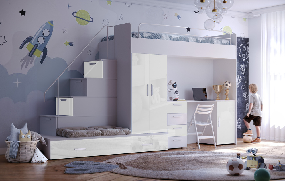 Drömmer du om att dina barn ska få ett mysigt och modernt rum där de inte bara kan leka utan också göra sina läxor? Sängen från EDEN-kollektionen är en produkt anpassad för de yngsta användarnas alla behov. Vita möbler som sätter en fashionabel touch till alla interiörer. Den innehåller 2 sovytor - en på toppen och den andra i den nedre lådan. Tack vare denna funktion kommer varje barn att ha sin egen sovplats. En speciell fördel här är trappor med inbyggda skåp som öppnar ner, där dina barn kan förvara alla sina leksaker. Det är värt att vara uppmärksam på säkerhetsräcken nära trappan och den övre sovytan, tack vare vilken ditt barn kommer att känna sig trygg när han sover eller rör sig. Sängen har ett skrivbord med rymliga lådor och hyllor, där ditt barn kan förvara nödvändiga skolmaterial, anteckningsböcker eller göra läxor. I setet ingår även en rymlig garderob för förvaring av kläder. Med den här sängen kommer ditt barnrum alltid att vara städat. Högkvalitativ platta, skyddar mot mekanisk skada. Produkten kommer att kunna användas i flera år och dina barn kommer att känna sig trygga i sitt rum.