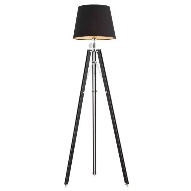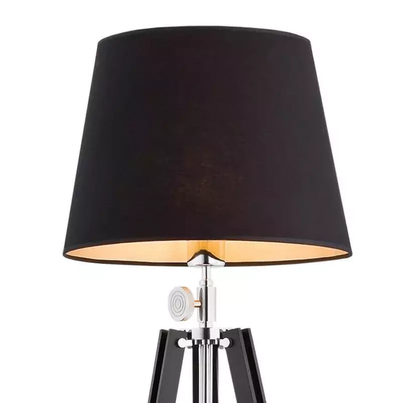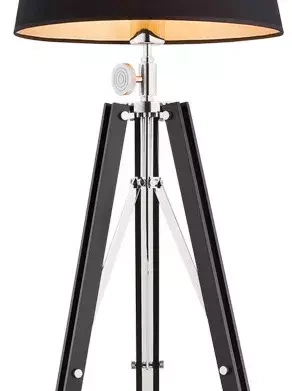 Lampan har ett stativ i svart färg och en svart lampskärm.