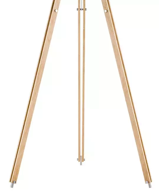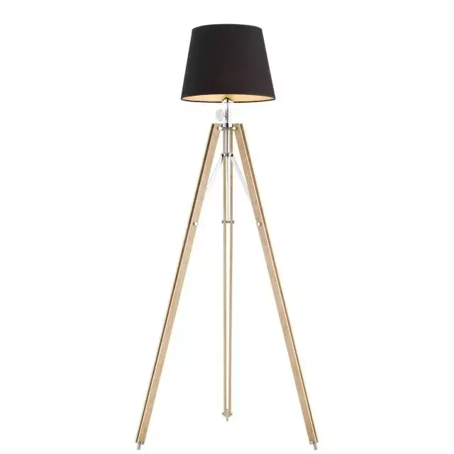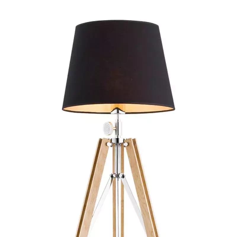 Lampan har ett stativ i naturlig träfärg och en svart lampskärm.