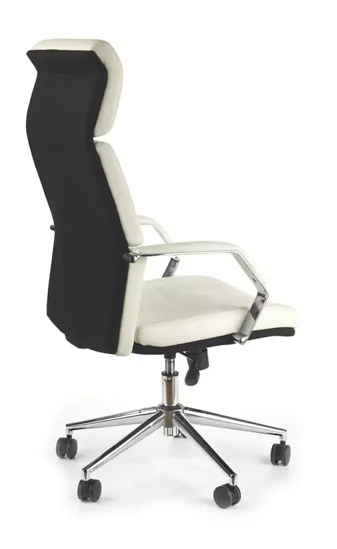 Kontorsstol COSTA kommer att vara perfekt i moderna rum och kommer att vara deras extra dekoration. Användningen av lätt klädsel hade en mycket positiv effekt på produktens utseende. Fåtöljens rygg är klädd i svart tyg, liksom botten och mellanrum mellan elementen. Denna lösning tillför inte bara charm, utan kontrasterar också med det vita överdraget av ekologiskt läder.