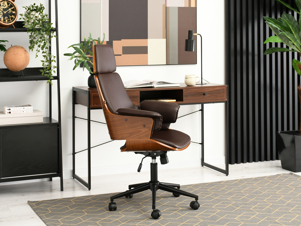 CLEMENS fåtölj finns tillgänglig i en elegant brun i nötaktig finish som smälter in perfekt med den svart bas. Dess mångsidiga design gör den till ett perfekt val för både kontoret,servicelokaler, såväl som studios hemma.