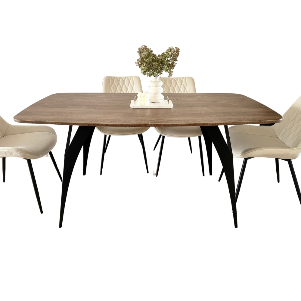 Skivan är tillverkad av 18 mm tjock lamineradskiva , i ek lefkas. Vi har beprövade bänkskivor från ledande tillverkare, som bland annat används vid tillverkning av köksmöbler. Laminatskivan är slitstark och lätt att hålla ren. Bordskonstruktionen är solid och stabil, vilket garanterar hållbarhet under många års användning. De svarta metallbenen, tillverkade av stål, smälter perfekt in i bordsskivan och ger en modern touch.