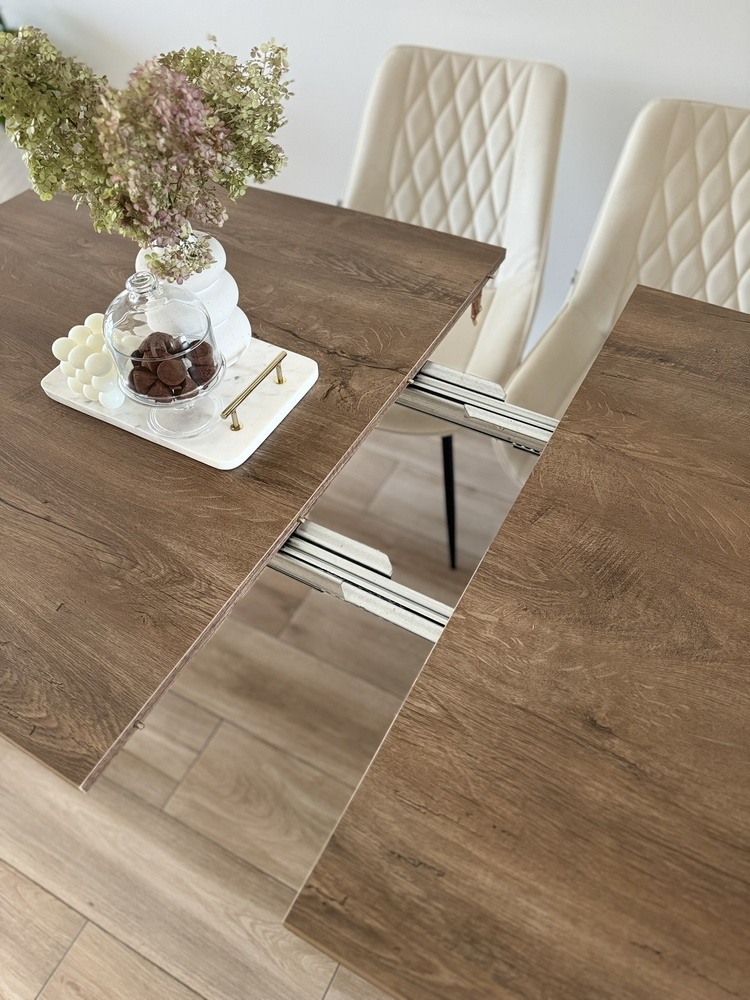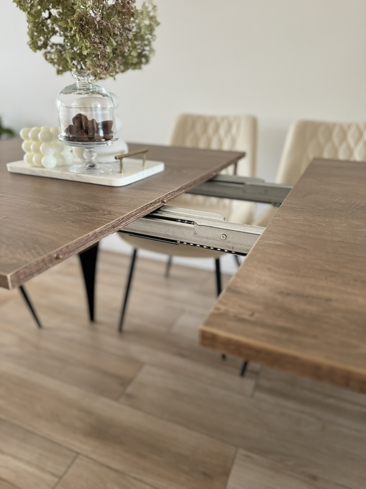 Ytterligare bordsfunktioner, t.ex. den utdragbara bordsskivan med två skivor på 50 cm vardera, gör att bordet kan förlängas från 180 cm till imponerande 280 cm. Detta är perfekt när du vill kunna bjuda in ett större antal personer utan att göra avkall på estetik och komfort.