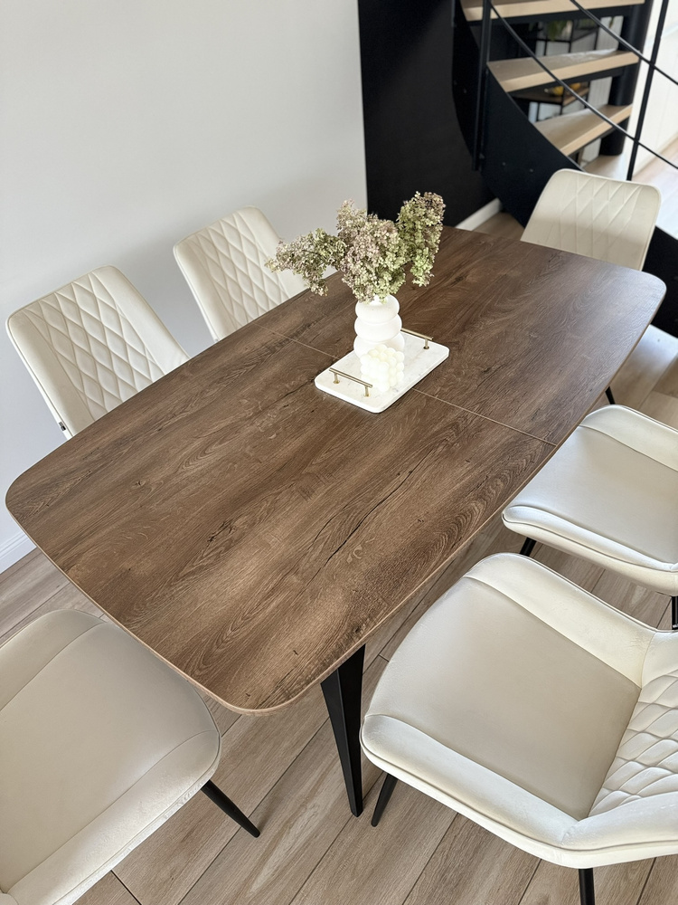 Bordsskivans ovala form ser inte bara extremt elegant ut, utan är också mycket praktisk. Denna form gör det möjligt att bekvämt placera fler personer samtidigt som man sparar utrymme i rummet. Tack vare detta är ELISMA-bordet perfekt för vardagliga måltider med familjen, såväl som för större sociala sammankomster eller fester. Den utfällda ytan på bordsskivan är 180x90 cm.