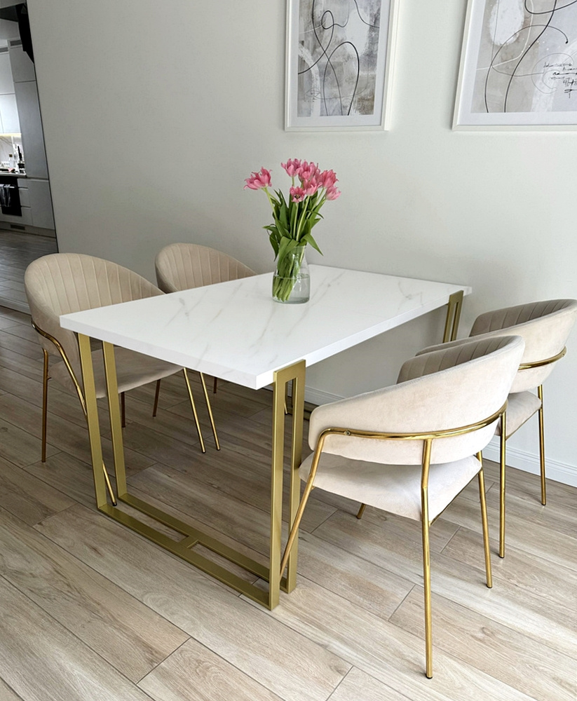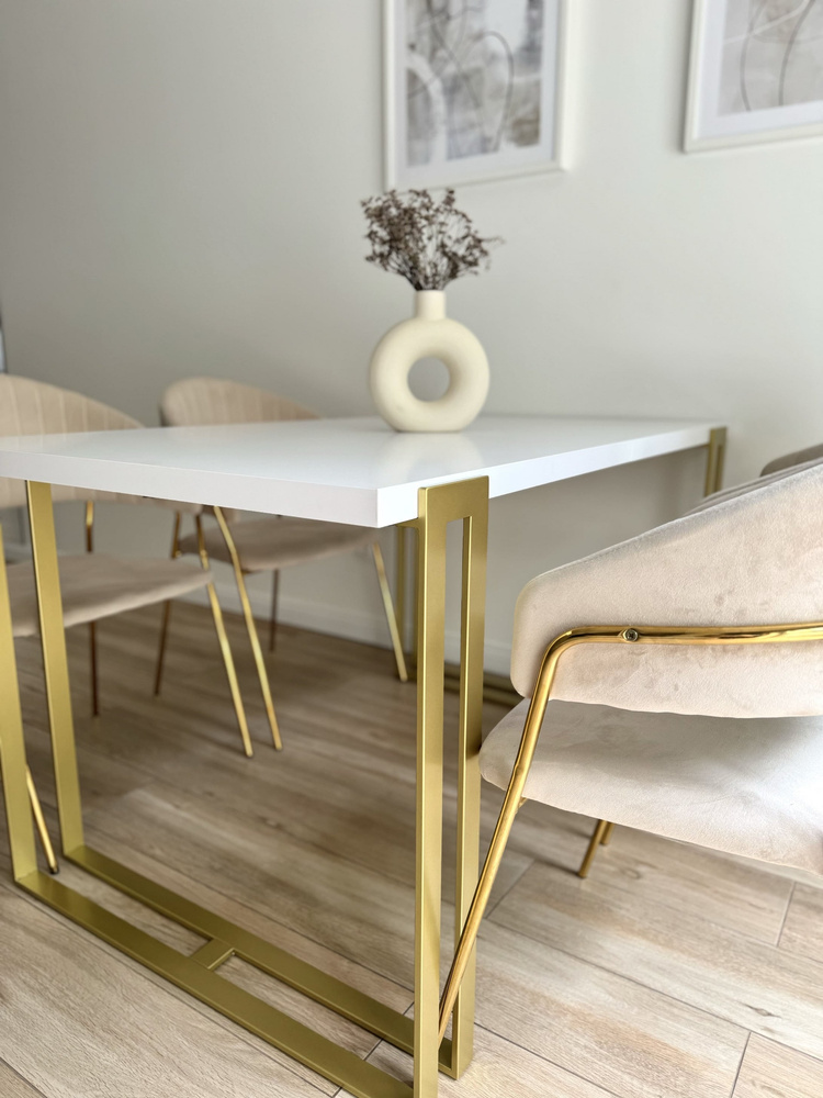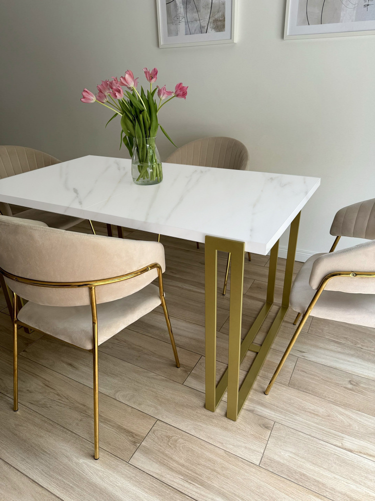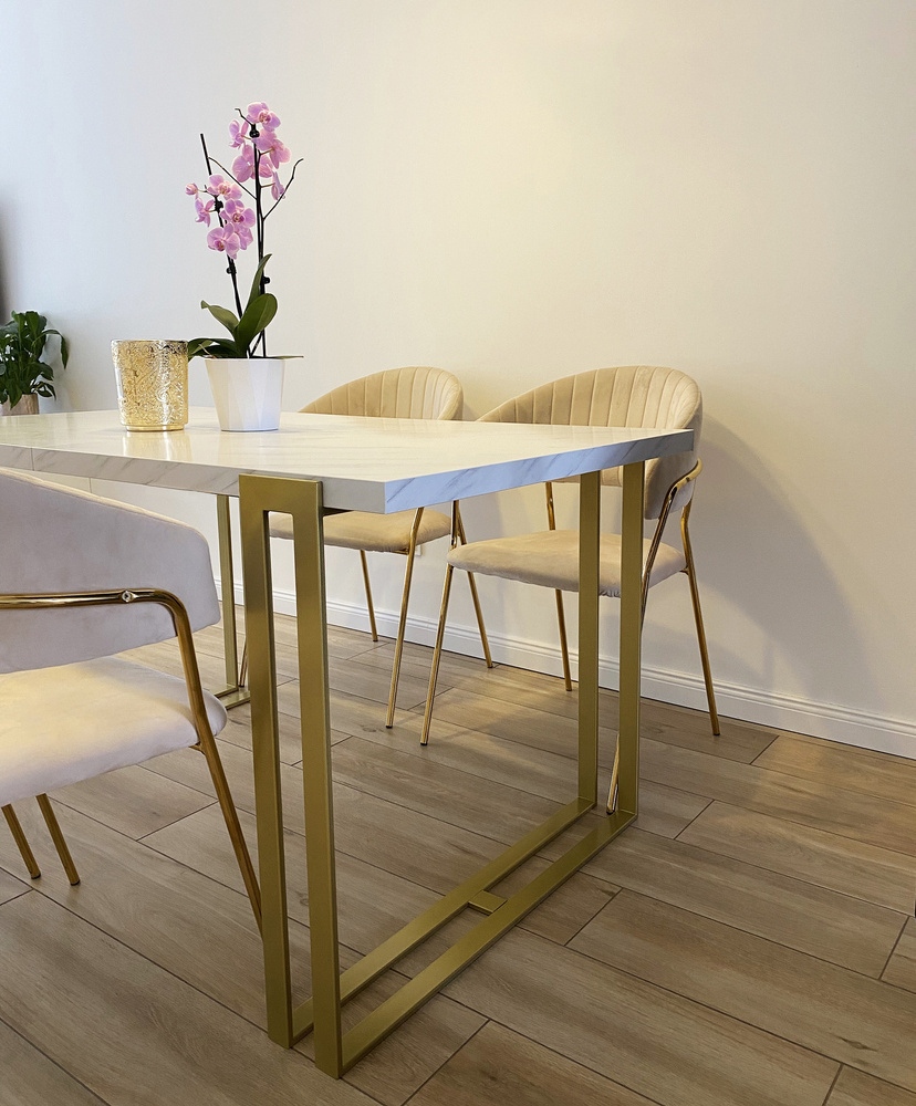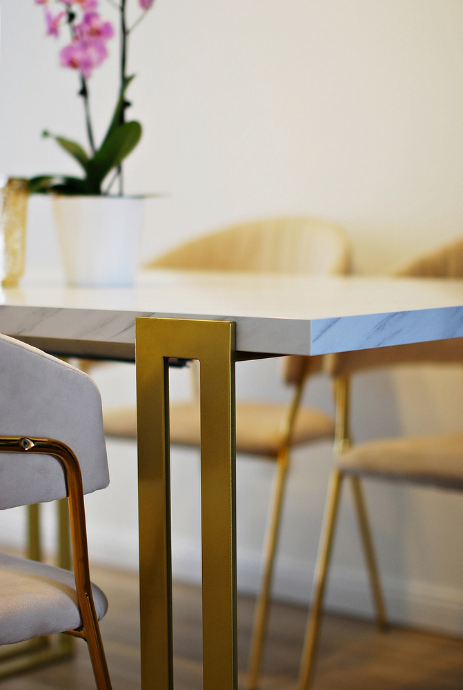 Moderna bord är en idealisk lösning för människor som gillar att kombinera klassisk elegans med design. Dess minimalism är original, och den förändrar husets interiör på ett originellt sätt, vilket ger det en tidlös stil. Den gyllene färgen på strukturen skapar en vacker kombination med bordsskivan och framhäver dess elegans. Därför, om du är en älskare av modern eller glamorös inredning, kommer det att vara ett utmärkt val.