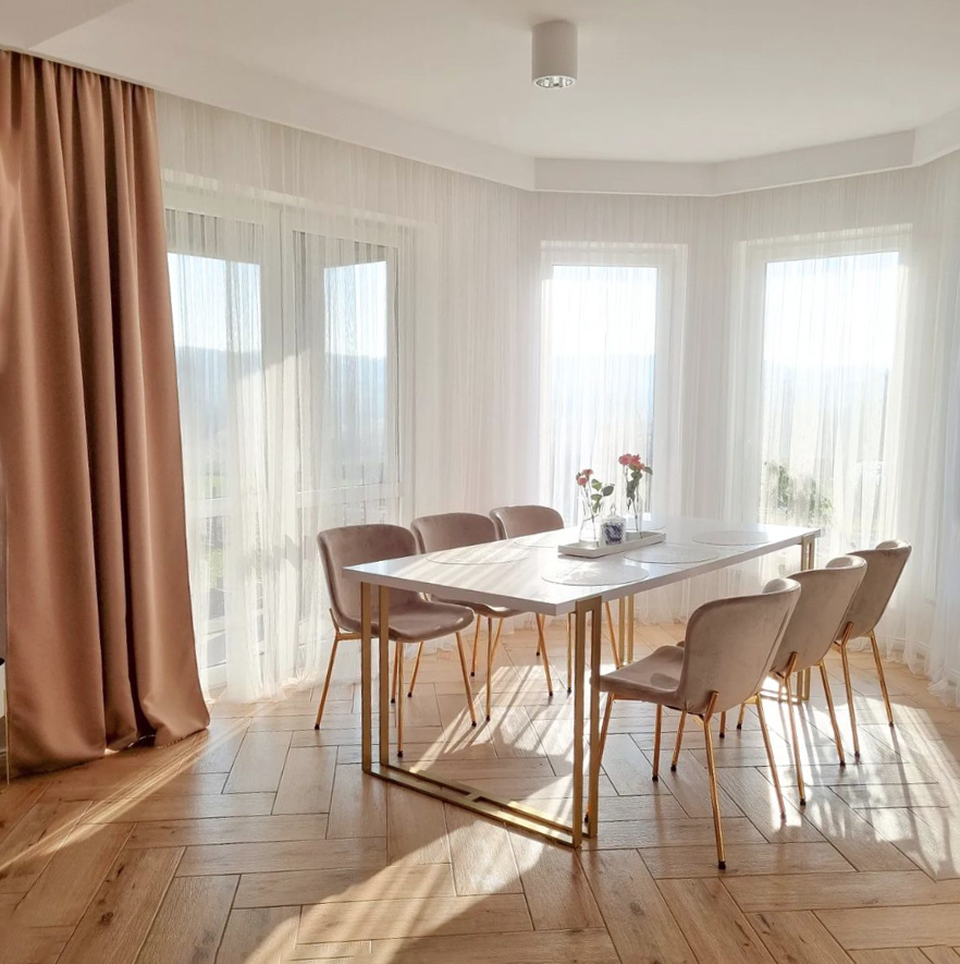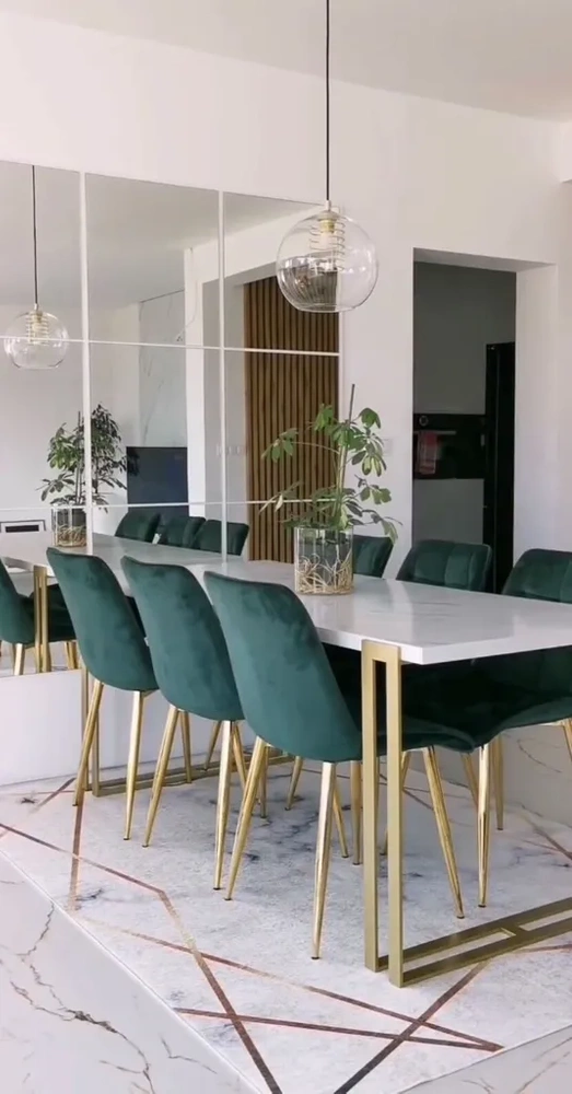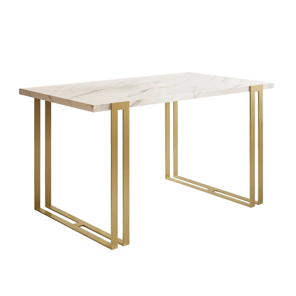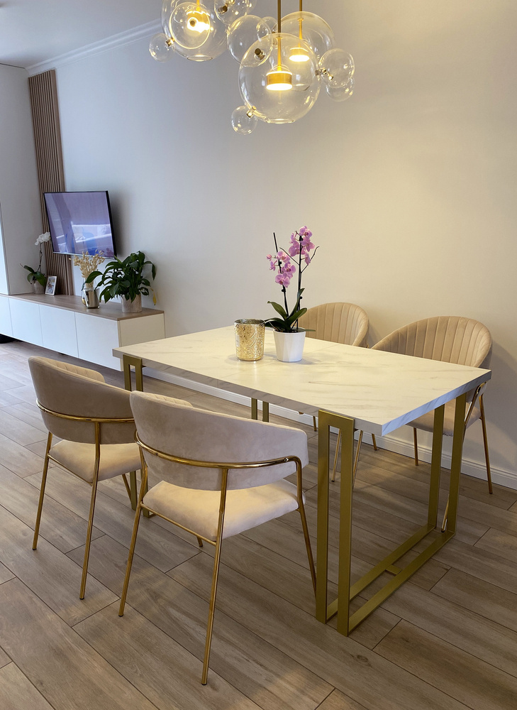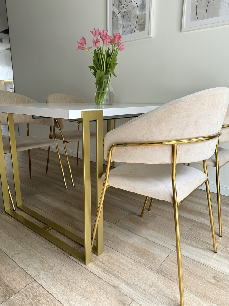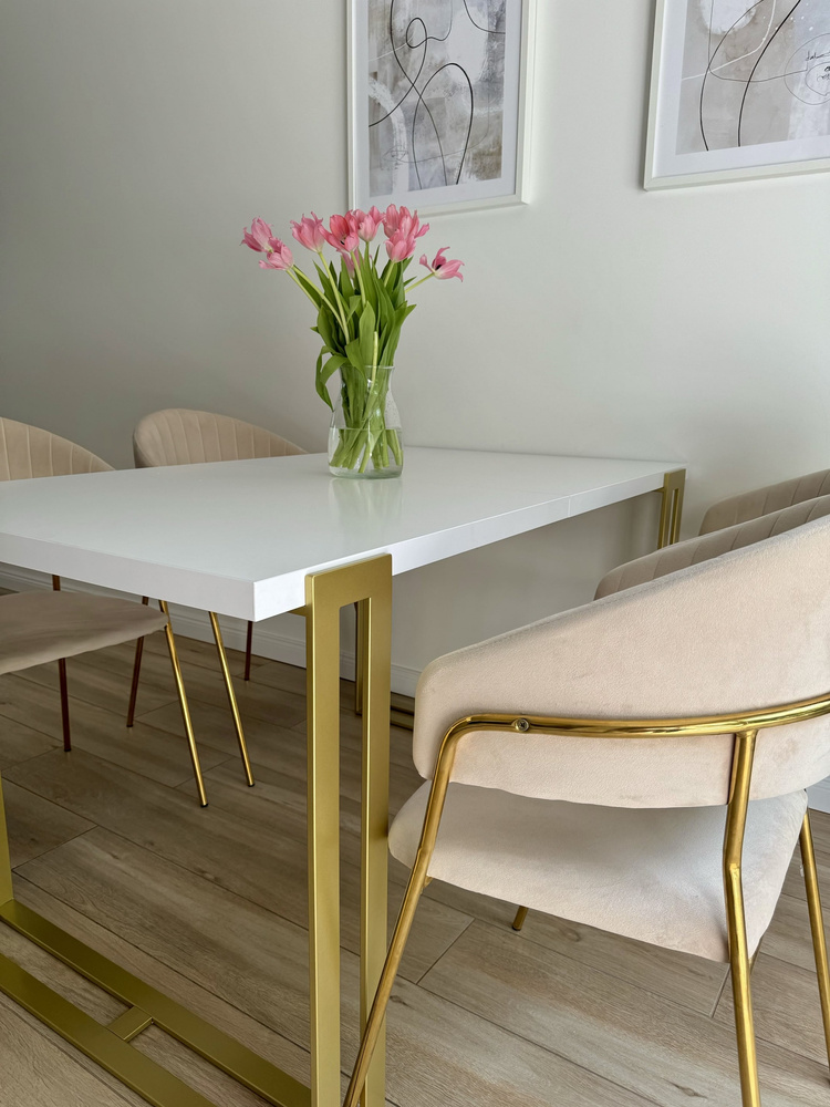 Moderna bord är en idealisk lösning för människor som gillar att kombinera klassisk elegans med design. Dess minimalism är original, och den förändrar husets interiör på ett originellt sätt, vilket ger det en tidlös stil. Den gyllene färgen på strukturen skapar en vacker kombination med bordsskivan och framhäver dess elegans. Därför, om du är en älskare av modern eller glamorös inredning, kommer det att vara ett utmärkt val.