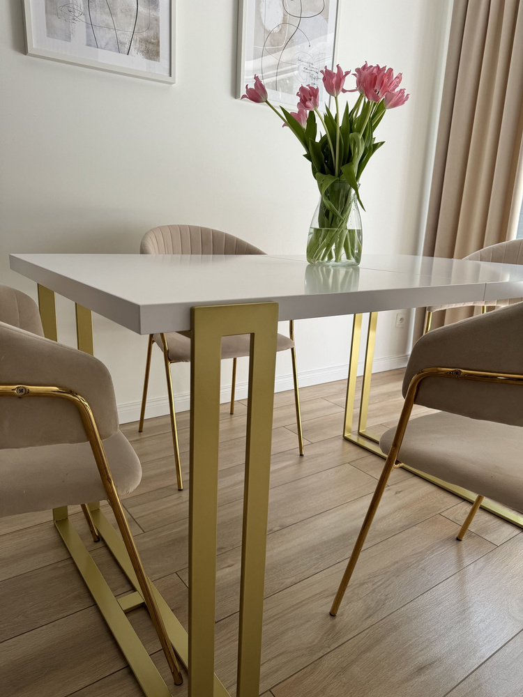 Matsalen är hemmets hjärta, och det viktigaste i den är förstås ... bordet! Ibland behövs inte mycket för att uppnå spektakulära effekter i inredningen. Allt du behöver är en rätt utvald möbel som kommer att dra till sig uppmärksamheten hos alla som kommer in i din matsal. Så vilket blir det perfekta bordet? Stor, rymlig, hopfällbar, lätt att använda, men samtidigt snygg och med en intressant design. Det finns många krav, men vi har en modell som uppfyller dessa förväntningar. Vi pratar om vårt HORTEN matbord. Framför allt imponerar denna design med en stor, vit bordsskiva monterad på vackra, gyllene ben. Tack vare detta utmärker den sig inte bara i sin funktionalitet och perfekta kvalitet på utförande, utan också i sitt vackra utseende. Bordsskivans yta är 160 / 260x90 cm. Dessutom kan du vika ut den till en större storlek när som helst. Horten utdragsbord har två insatser, vardera 50 cm breda. Tack vare detta kan du förstora den med upp till en meter och passa hela familjen. Älskar du också långa familjemåltider vid köksbordet, fulla av samtal, skratt och läckra rätter? Med detta utdragbara bord kommer du garanterat att uppfylla dina förväntningar.