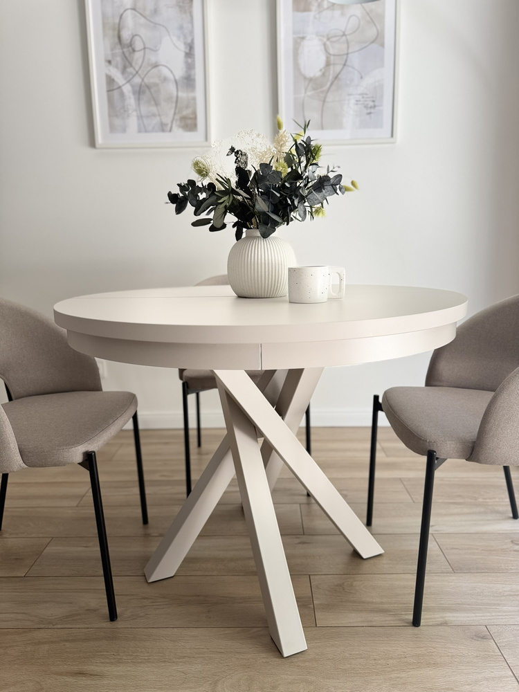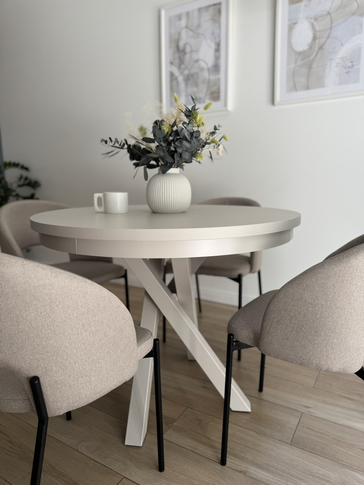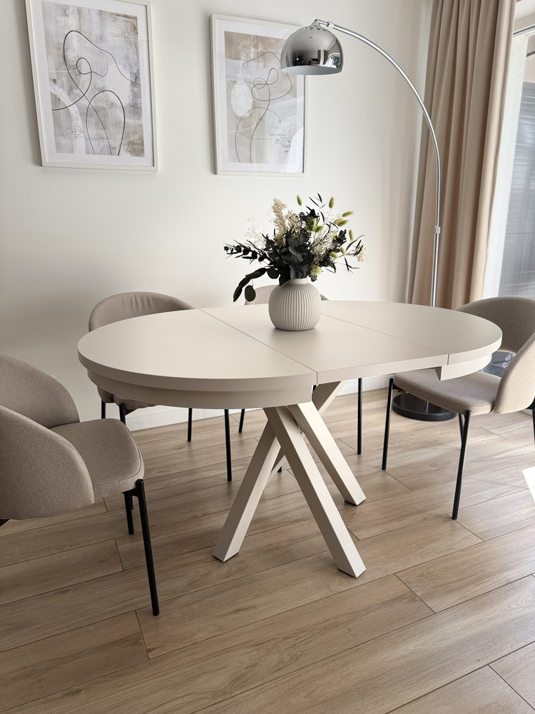Den helt enhetliga kaschmirfärgen gör att bordet passar in i både skandinaviska, moderna och minimalistiska inredningar. Det runda matbordet PASCAL vilar på ett dekorativt metallben med en unik design. Den matta ytan och pulverlackerade metallramen i samma färg skapar en estetisk, harmonisk helhet. Den 32 mm tjocka bordsskivan garanterar hållbarhet och enkel rengöring, medan den solida ramen ger helheten en modern karaktär. Dessutom skyddar PVC-kanten bordsskivan mot mekaniska skador. Precis finish, stabil konstruktion och reptålighet gör att bordet kommer att glädja ögat under lång tid. Det är ett bord som inte behöver kontraster – dess styrka ligger i enkelheten och detaljerna.