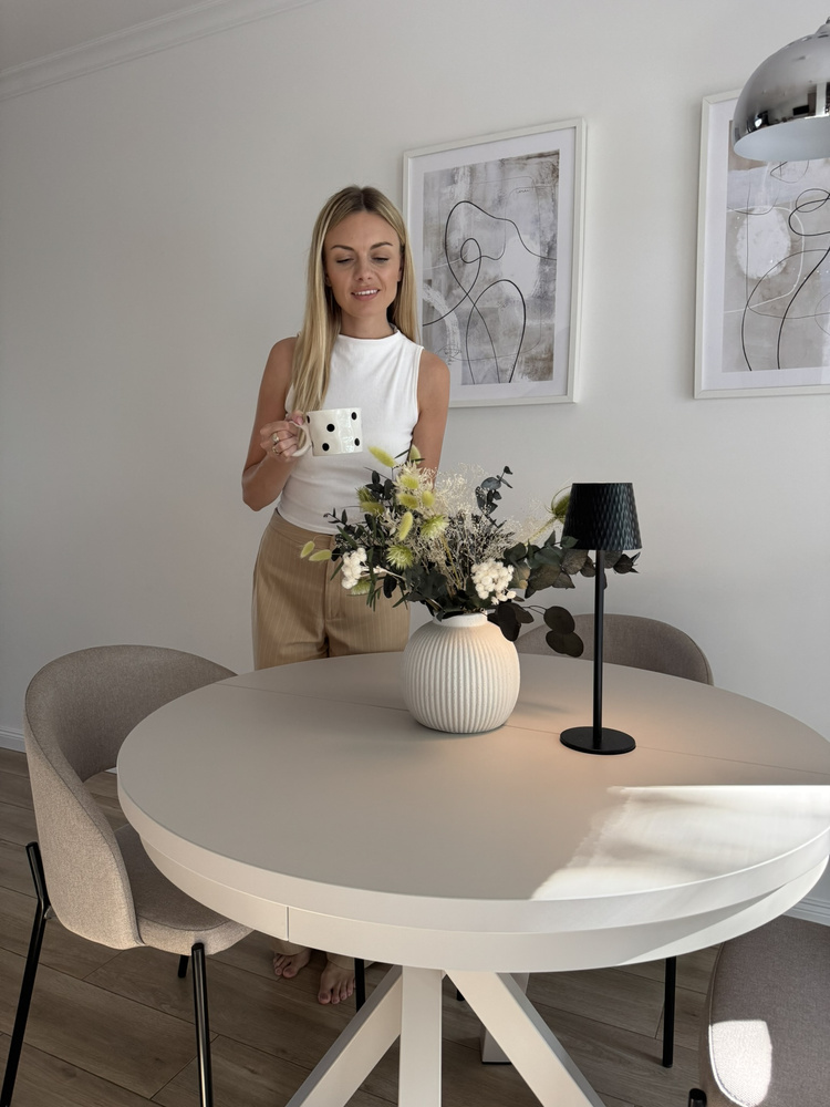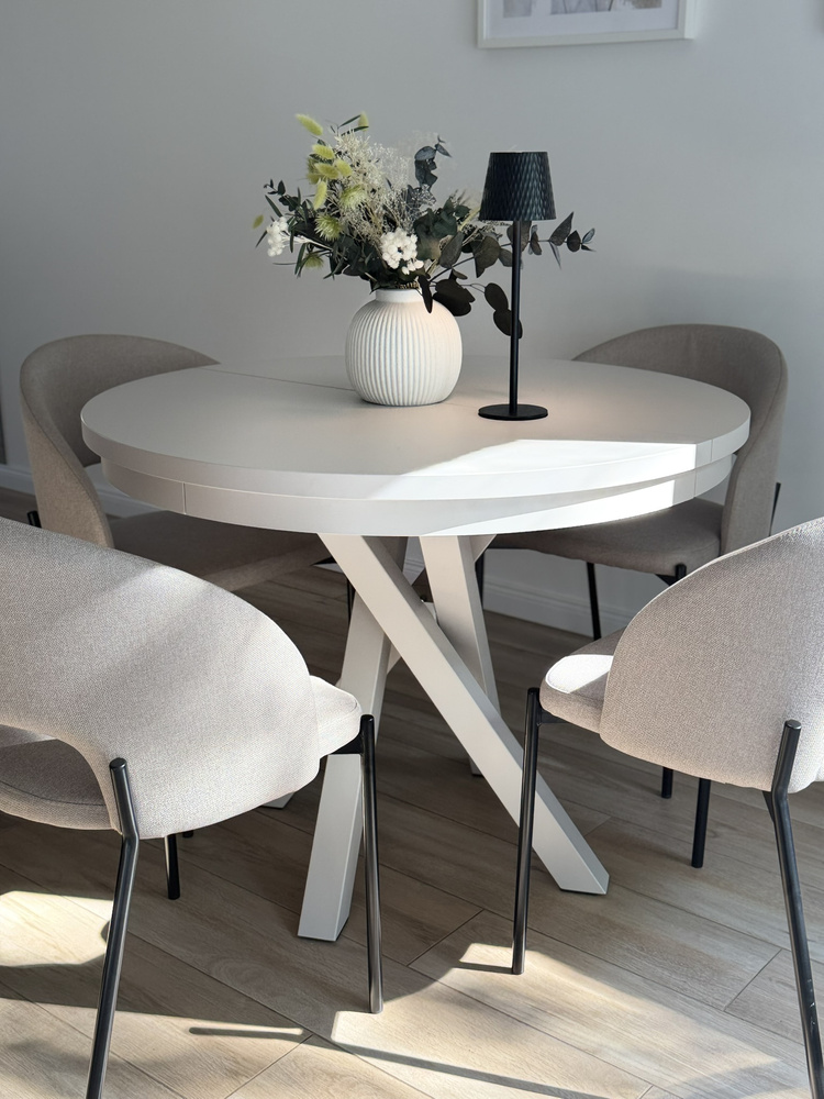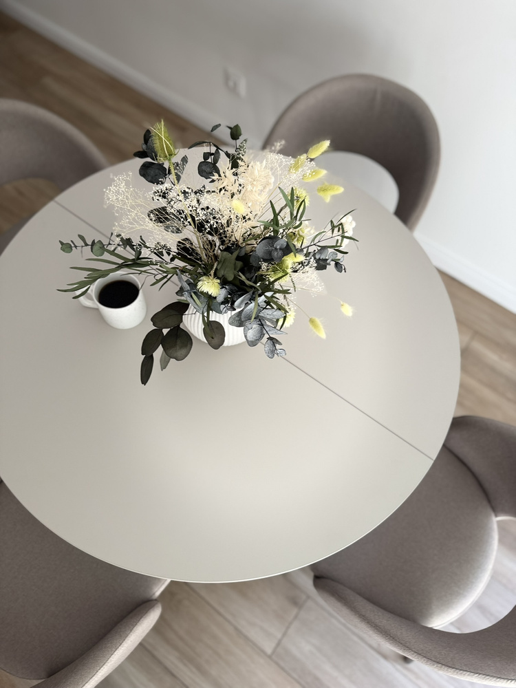 Om du letar efter ett elegant och funktionellt bord till matsalen, köket eller vardagsrummet är PASCAL i kashmir det perfekta valet. Det runda utdragbara bordet, som kan förlängas från 90 till 130 cm, passar både för vardagsbruk och familjesammankomster. De dämpade färgerna och den enhetliga formen i kasmirfärg ger bordet en modern och samtidigt mysig karaktär.