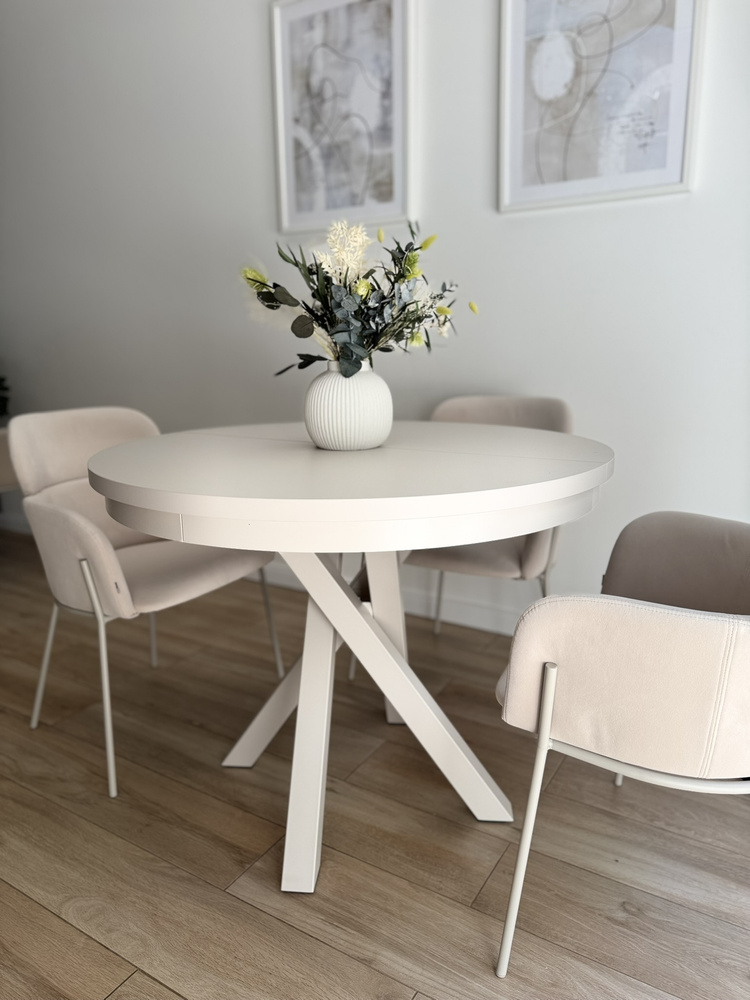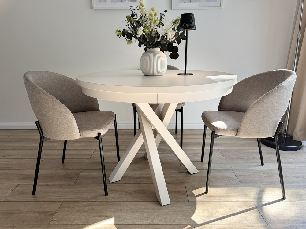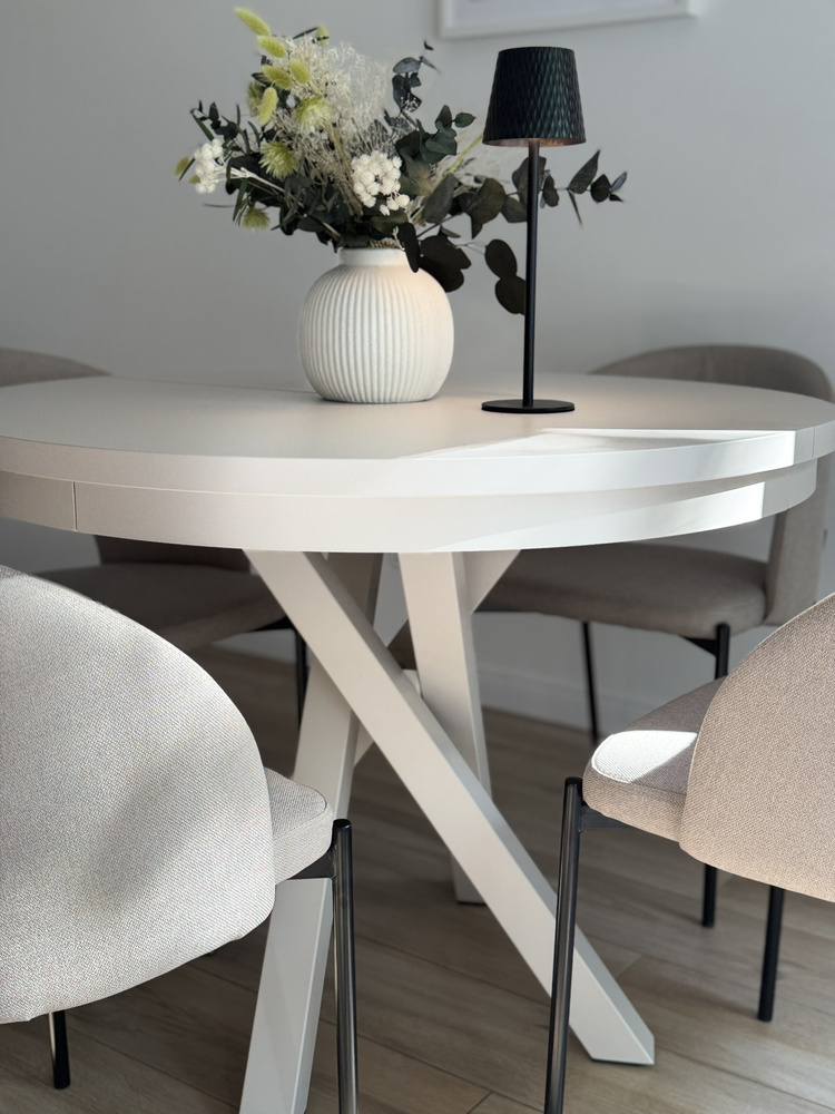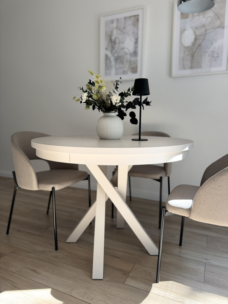 Det utdragbara bordet PASCAL är den perfekta lösningen för dig som uppskattar funktionalitet i en elegant form. Den smidiga diametern på 90 cm gör att det passar perfekt även i mindre utrymmen, och möjligheten att dra ut bordet med hjälp av en extra insats gör det bekvämt för större sällskap.