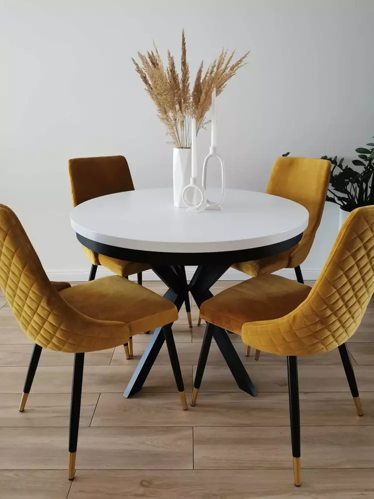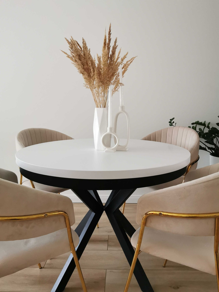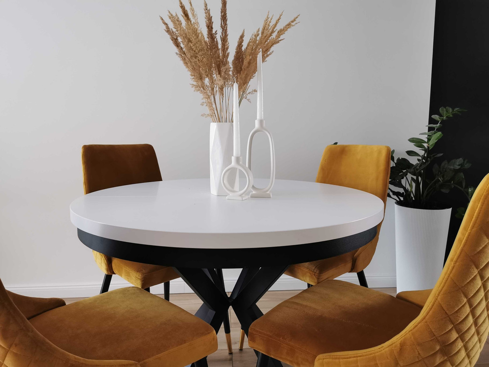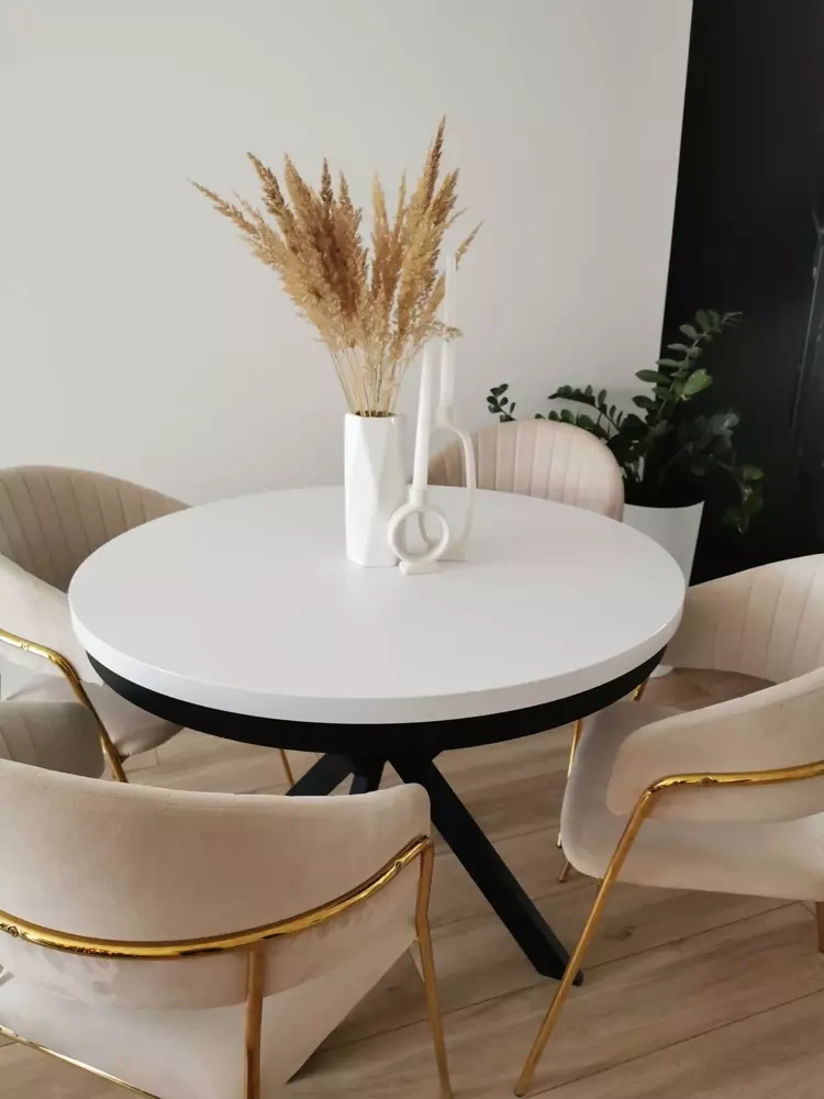 Denna modell imponerar framför allt med sin stora, vita bordsskiva. Tack vare sina små mått är det runda bordet EDWARD 90 cm perfekt för en liten matsal, ett kök eller ett vardagsrum. På bara några minuter kan du enkelt förlänga den från 90 cm till 130 eller till och med 170 cm genom att fästa ytterligare insatser. På så sätt behöver du inte oroa dig för var du ska placera dina gäster. Den här modellen har kompletterats med en 5 cm stilfull kant under bordsskivan, så att löparna är täckta och det hela ser elegant ut.