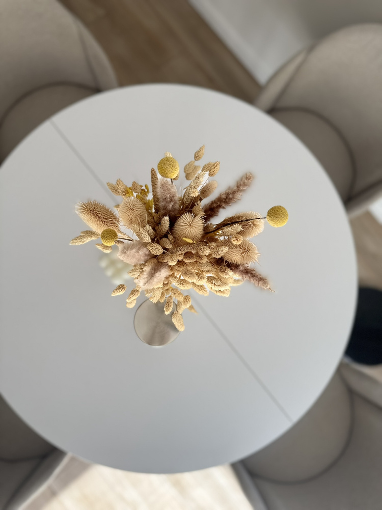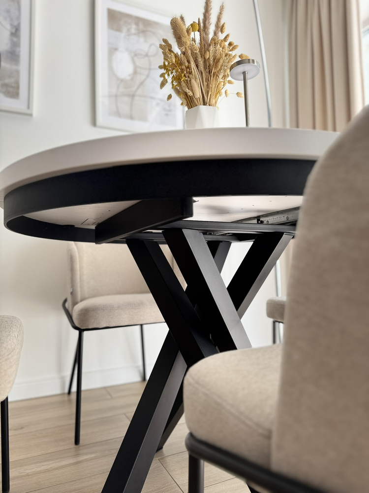 Tar inte mycket plats i vardagen, men när du behöver det – växer det med dina behov. Bordskivan med en diameter på 100 cm är tillverkad av laminerad skiva. En ytterligare fördel är att du på bara några minuter enkelt kan fälla ut den från 100 cm till 140 genom att fästa en extra insats. Det tar bara några ögonblick att öka bordsskivans yta när du behöver mer plats eller fälla ihop den när utrymmet kräver en mer kompakt lösning. I hopfällt läge rymmer det utan problem 4 personer, och tack vare utdragsfunktionen kan du snabbt göra plats för 6 personer. Därför passar det perfekt i en liten matsal eller ett vardagsrum i öppen planlösning.
