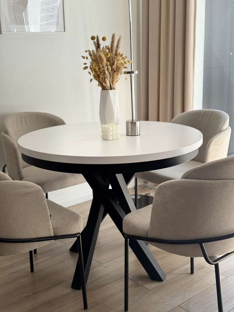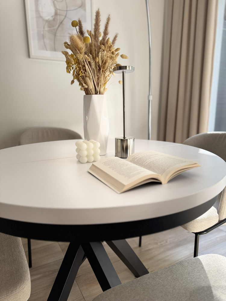PASCAL är ett bord för små utrymmen som kombinerar ett tidlöst utseende med moderna detaljer. Den klassiska vita färgen i kombination med den svarta basen gör det till ett utmärkt val för moderna eller loftinspirerade interiörer. Den runda formen främjar samtal och gemensamma måltider, och utdragsfunktionen gör att bordet kan anpassas efter tillfället.