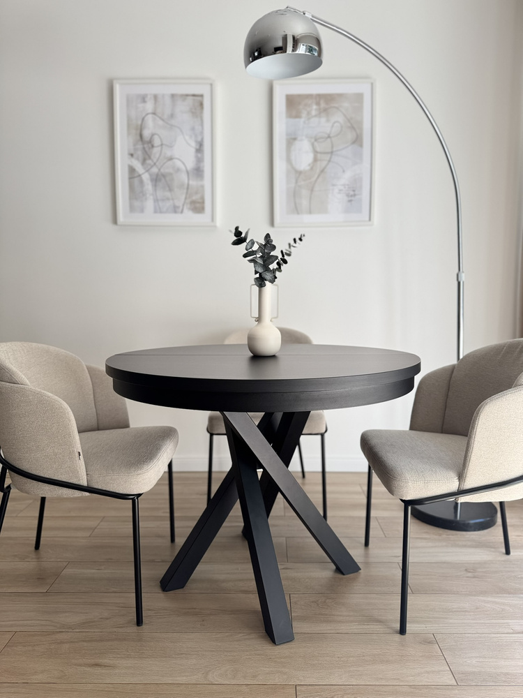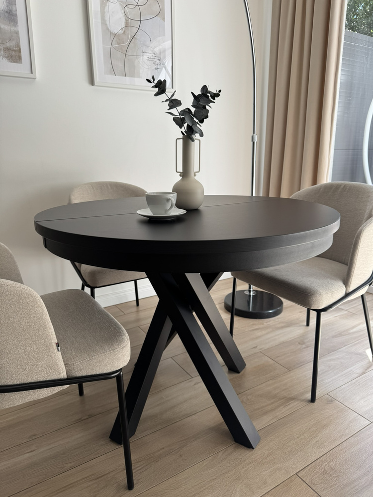 Modellen PASCAL i total black är en kvintessens av modern loftstil. Det runda bordet kan fällas ut från 100 till 140 cm och är helt i matt svart, vilket ger det ett uttrycksfullt, elegant och samtidigt universellt utseende. Det passar perfekt i matsalen, köket eller vardagsrummet – särskilt i industriella, minimalistiska inredningar eller med en touch av glamour.