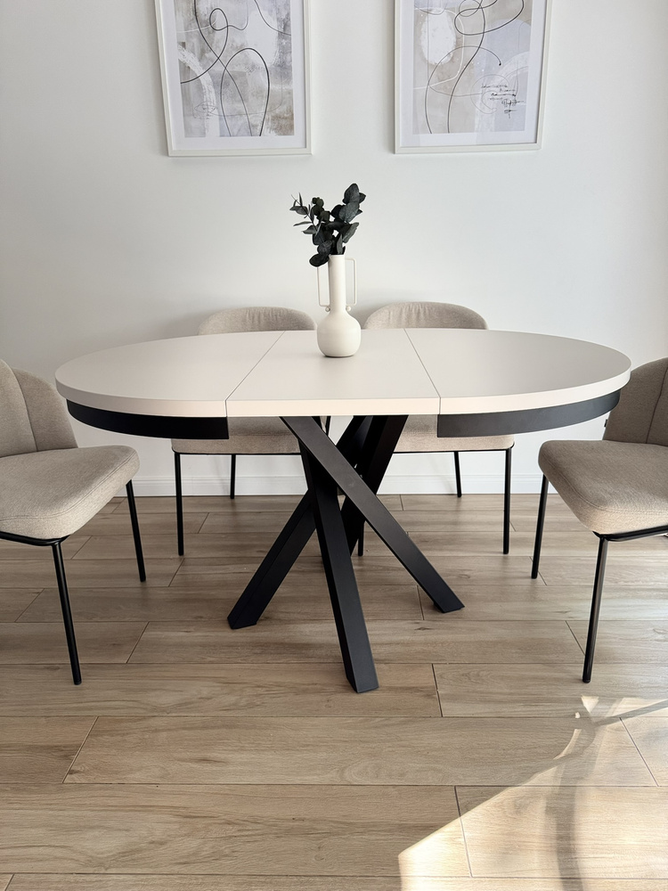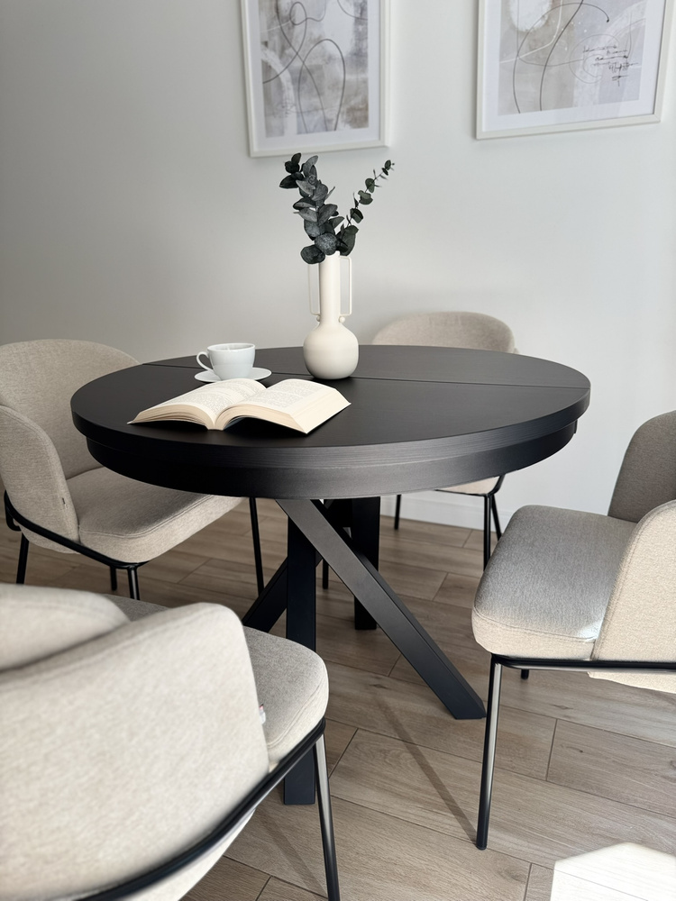 Tar inte mycket plats i vardagen, men när du behöver det – växer det med dina behov. Skivan med en diameter på 100 cm är tillverkad av laminerad skiva. En ytterligare fördel är att du på bara några minuter enkelt kan fälla ut den från 100 cm till 140 genom att fästa en extra insats. Det tar bara några ögonblick att öka bordsskivans yta när du behöver mer plats eller fälla ihop den när utrymmet kräver en mer kompakt lösning. I hopfällt läge rymmer det utan problem 4 personer, och tack vare utdragsfunktionen kan du snabbt göra plats för 6 personer. Därför passar det perfekt i en liten matsal eller ett vardagsrum i öppen planlösning.