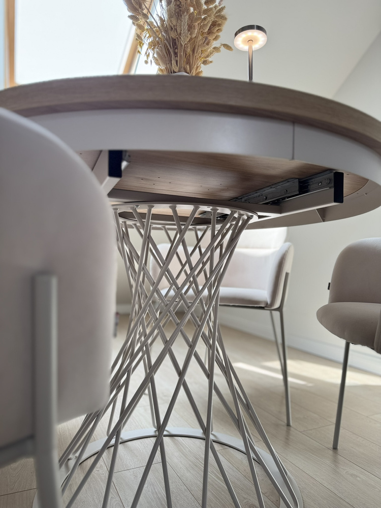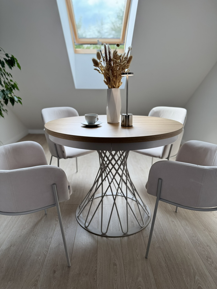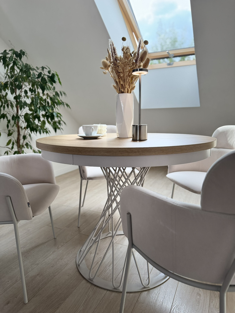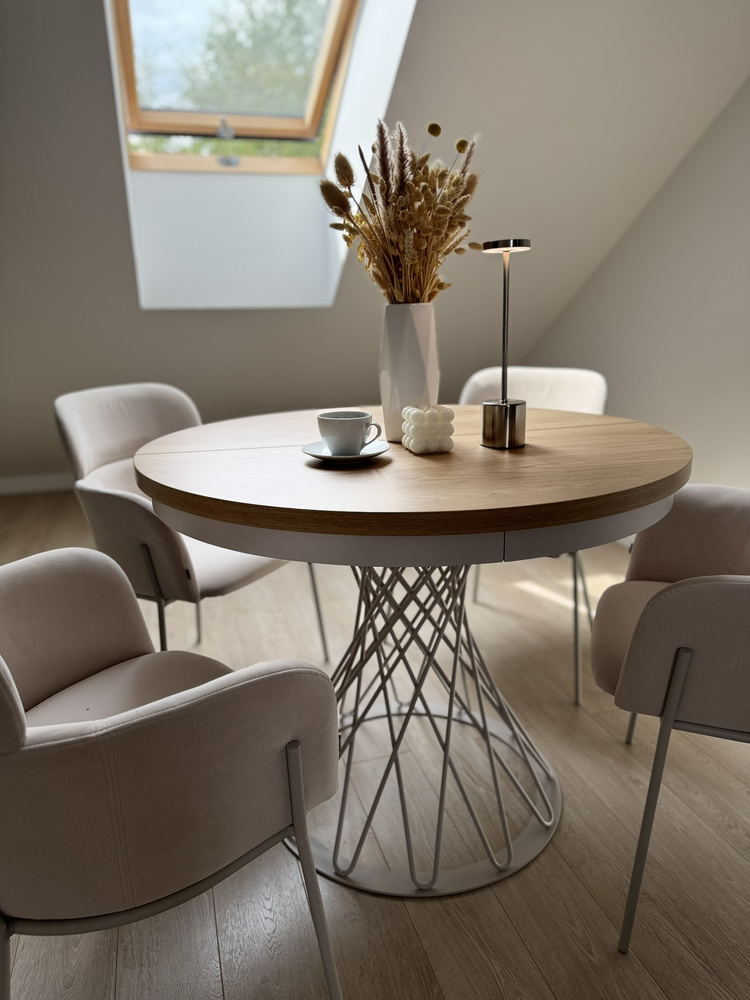 Bordet Gardino 100/140 cm är ett unikt möbel som kombinerar modern design med loftliknande lätthet. Den runda bordsskivan i naturlig ek kan förlängas till 140 cm, vilket gör den till ett perfekt val för både vardag och fest. Den öppna, kashmirfärgade basen i metall ger den en lätthet och en unik stil. GARDINO passar perfekt i ljusa, mysiga interiörer – både i matsalen och i vardagsrummet.