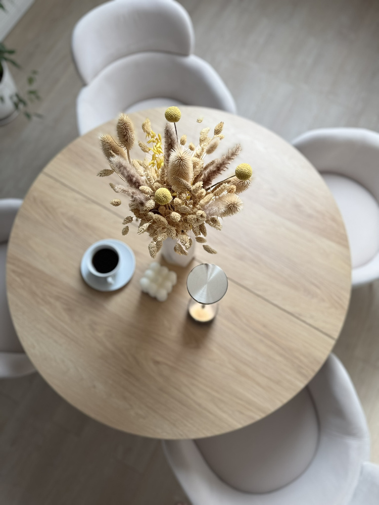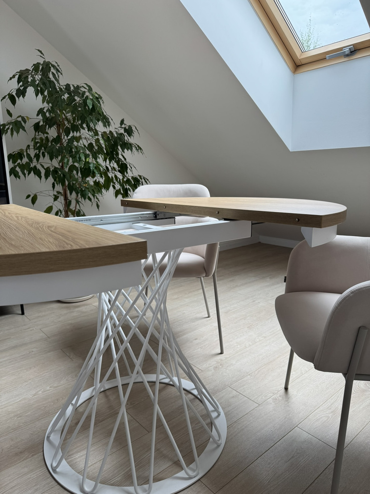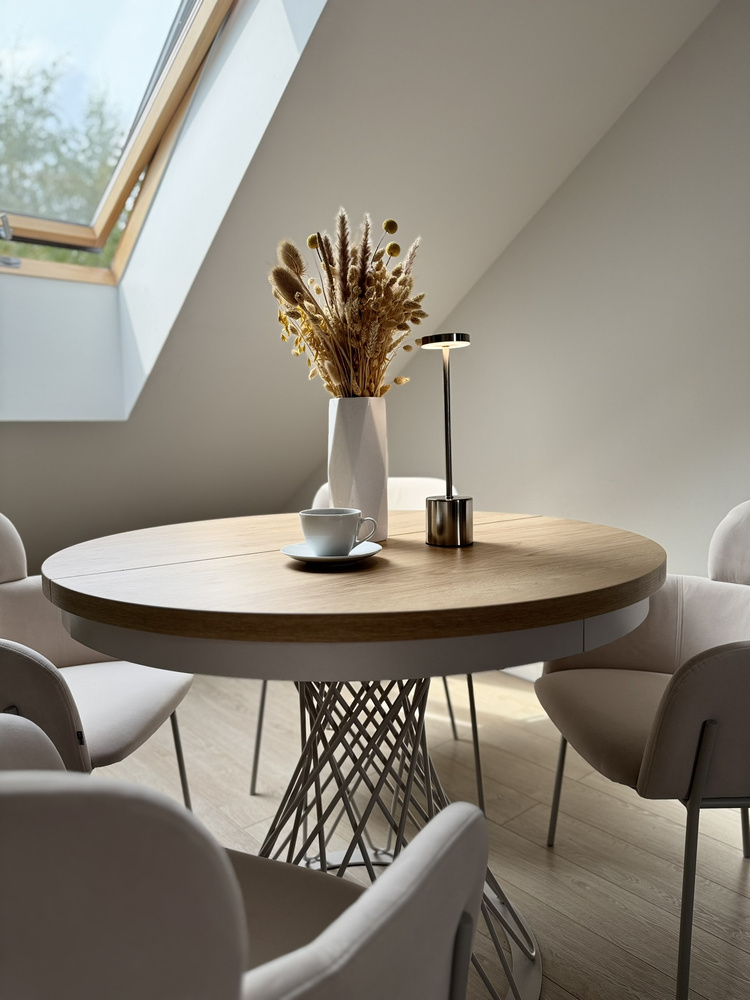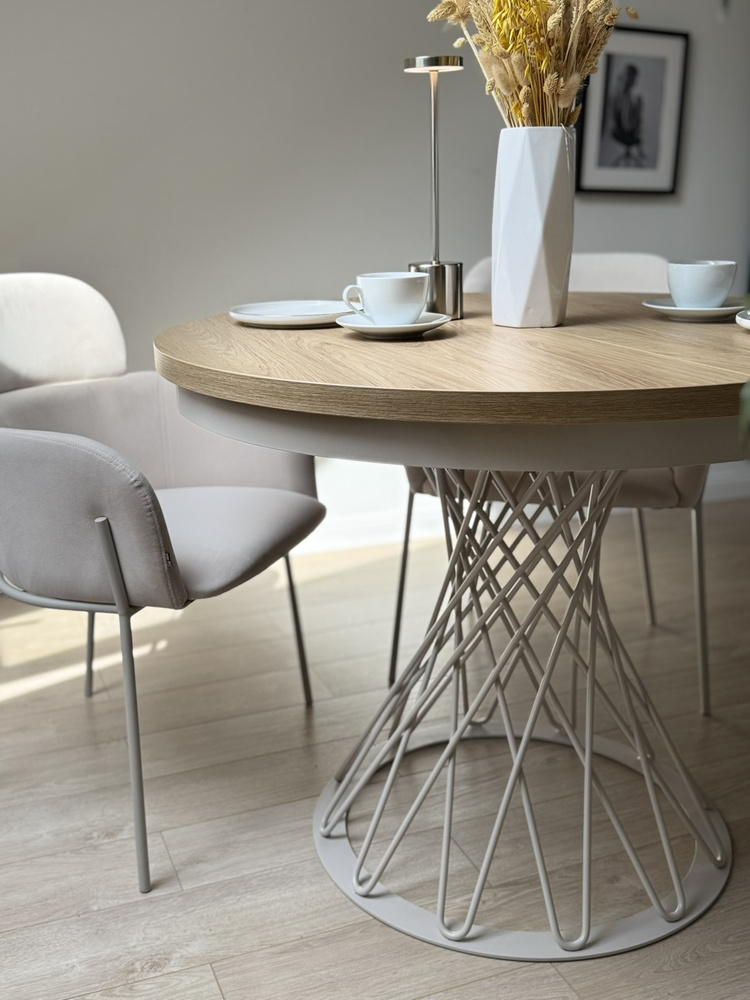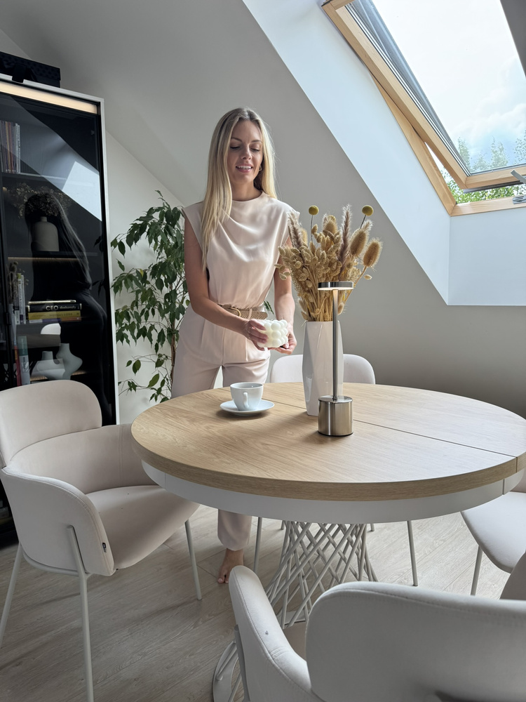 Bordet Gardino 100/140 cm är ett unikt möbel som kombinerar modern design med loftliknande lätthet. Den runda bordsskivan i naturlig ek kan förlängas till 140 cm, vilket gör den till ett perfekt val för både vardag och fest. Den öppna, kashmirfärgade basen i metall ger den en lätthet och en unik stil. GARDINO passar perfekt i ljusa, mysiga interiörer – både i matsalen och i vardagsrummet.