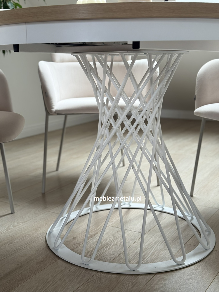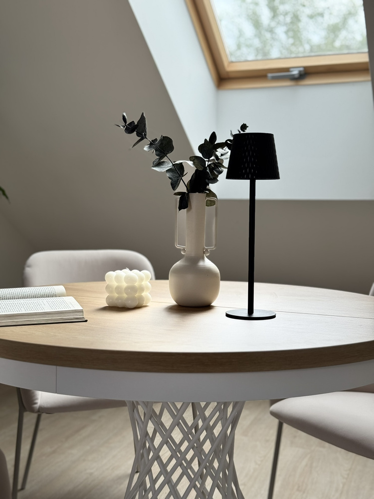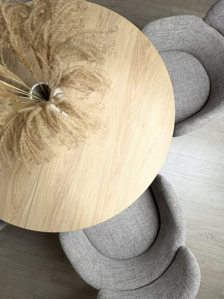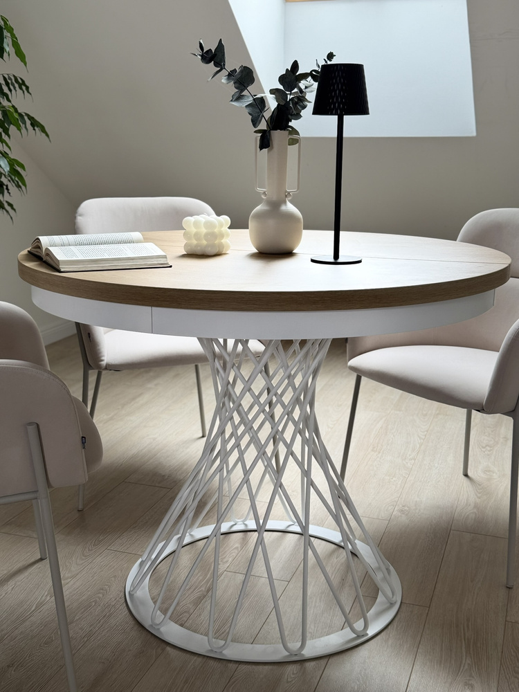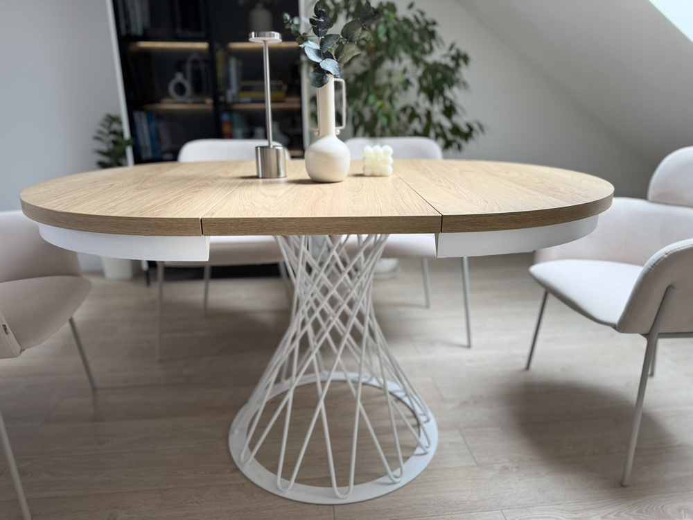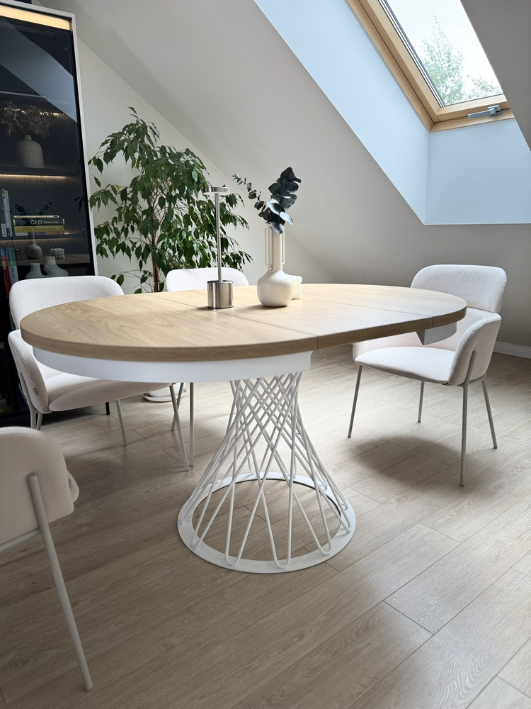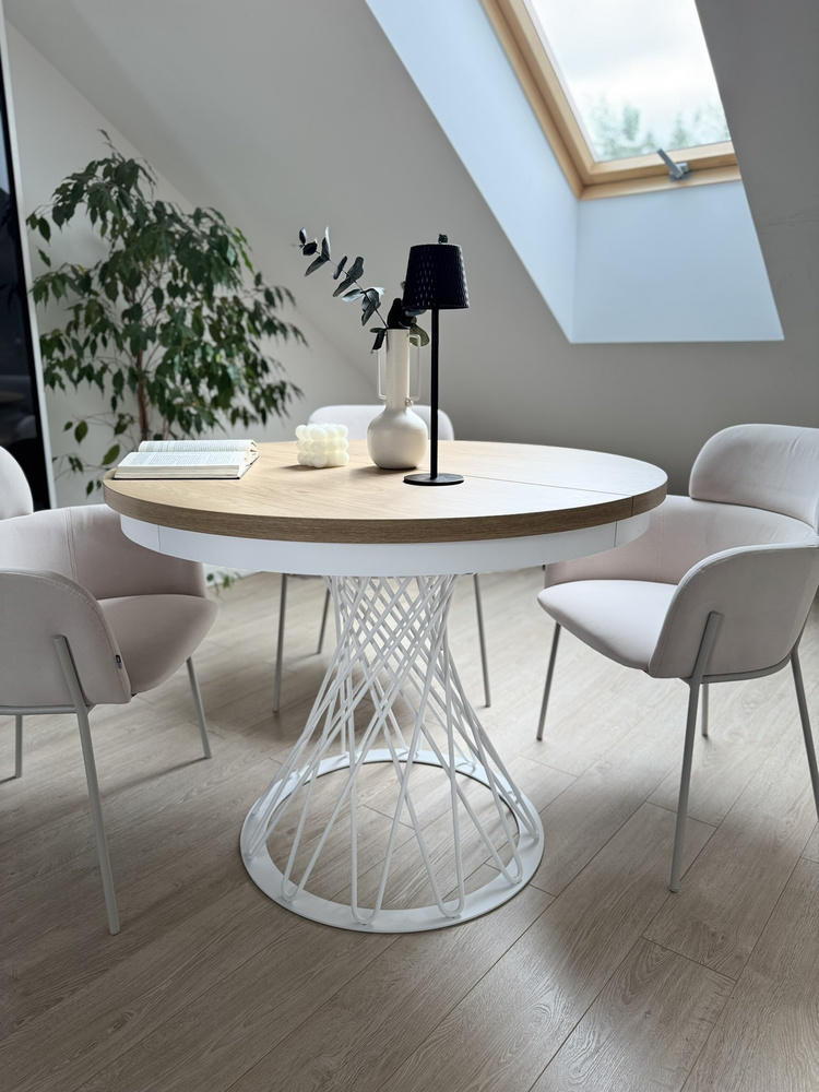 Bordet Gardino 100/140 cm är ett unikt möbel som kombinerar modern design med loftliknande lätthet. Den runda bordsskivan i naturlig ek kan förlängas till 140 cm, vilket gör den till ett perfekt val för både vardag och fest. Den öppna, vita basen i metall ger den en lätthet och en unik stil. GARDINO passar perfekt i ljusa, mysiga interiörer – både i matsalen och i vardagsrummet.