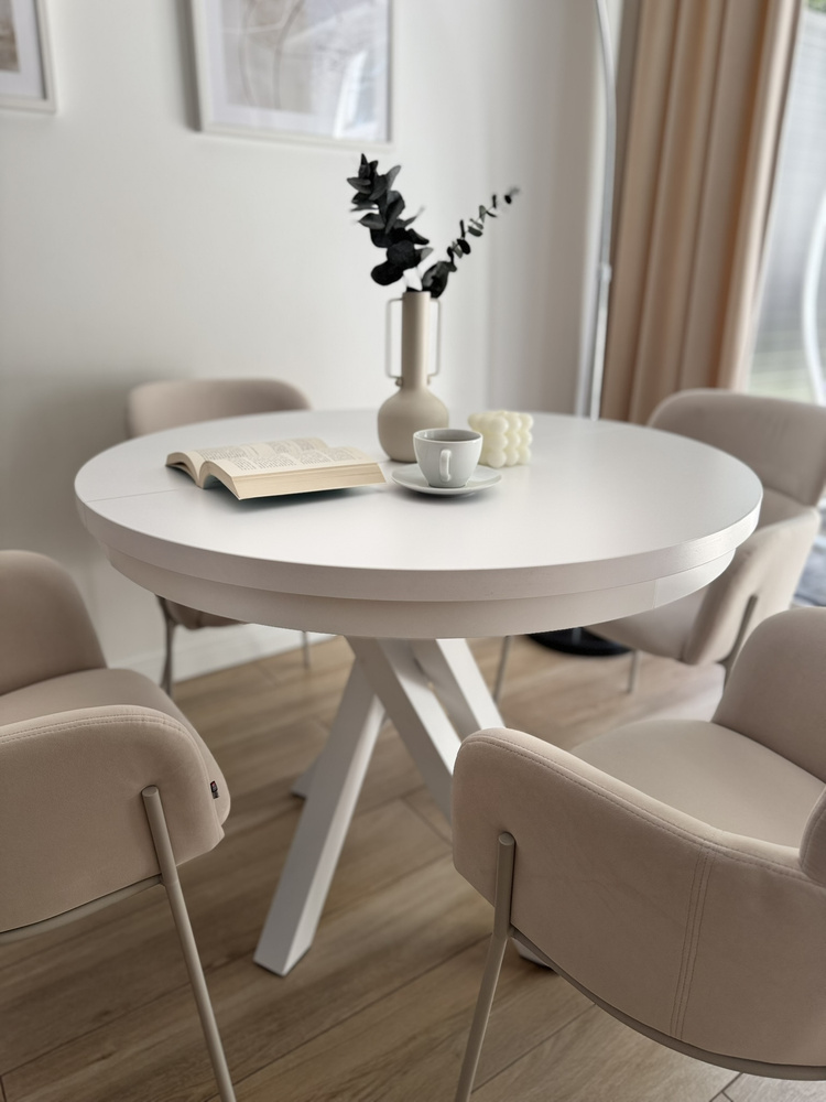 Det utdragbara bordet PASCAL är den perfekta lösningen för dig som uppskattar funktionalitet i en elegant form. Den smidiga diametern på 100 cm gör att det passar perfekt även i mindre utrymmen, och möjligheten att dra ut bordet med hjälp av en extra insats gör det bekvämt för större sällskap.