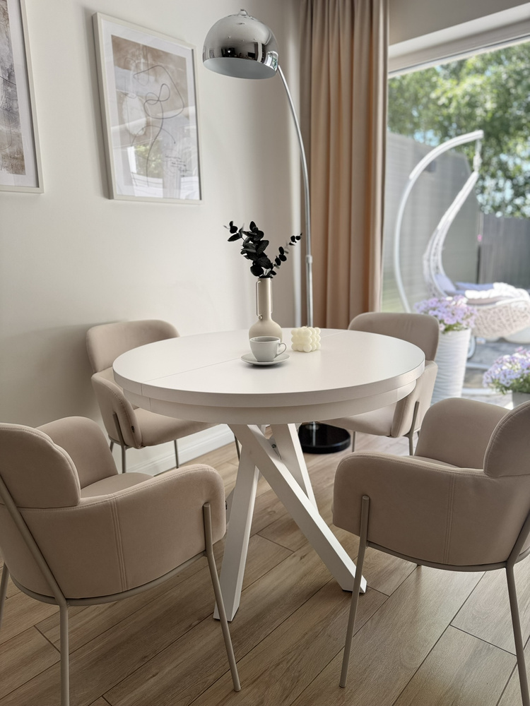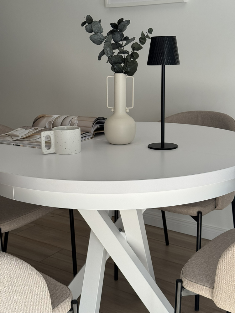 Vitt är en färg som aldrig går ur mode. Det runda bordet i matt vitt passar både i ljusa interiörer i skandinavisk stil och i moderna, minimalistiska utrymmen. Dess metallstativ och bordsskiva i enhetlig vit skapar en sammanhängande och visuellt lätt form. Det passar perfekt in i konceptet ”mindre är mer”. Den 32 mm tjocka bordsskivan garanterar hållbarhet och enkel rengöring, medan den solida ramen ger helheten en modern karaktär. Dessutom skyddar PVC-kanten bordsskivan mot mekaniska skador. Precis finish, stabil konstruktion och reptålighet gör att du kommer att ha glädje av bordet under lång tid. Det är ett bord som inte behöver kontraster – dess styrka ligger i enkelheten och detaljerna.