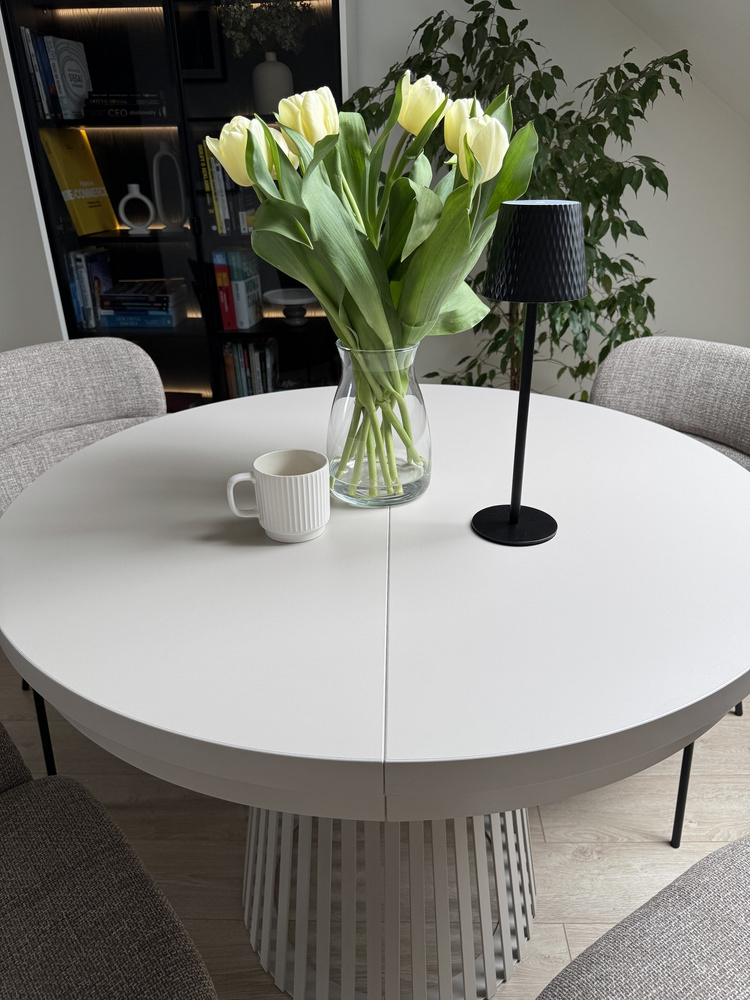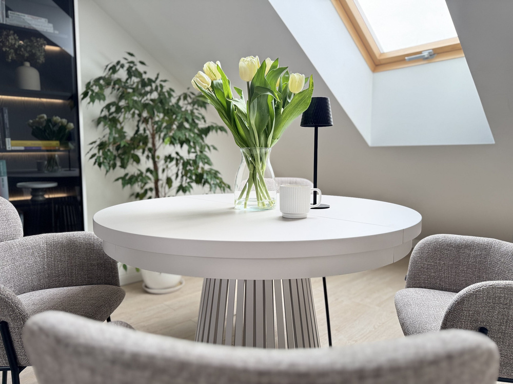 ALEXANDER är den perfekta lösningen för köket, matsalen eller vardagsrummet där du träffar gäster för kaffe eller middag. Bordet med rund skiva är en väl genomtänkt produkt i alla avseenden. I hopfällt läge rymmer det enkelt 5 personer, och tack vare fällfunktionen kan du snabbt förbereda en plats för en större samling av familj eller vänner. Bordsskivan har en diameter på 120 cm och är tillverkad av laminerad kartong. Dess extra fördel är att du på bara några minuter enkelt kan förlänga den från 120 cm till 160 eller till och med 200 cm genom att fästa ytterligare insatser. På bara några ögonblick kan du öka bordsskivans yta när du behöver mer utrymme, eller fälla ner den när utrymmet kräver en mer kompakt lösning. Därför passar det perfekt för en liten matsal eller ett vardagsrum som är anslutet till köket.