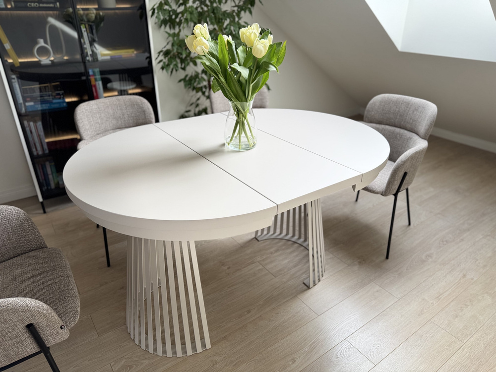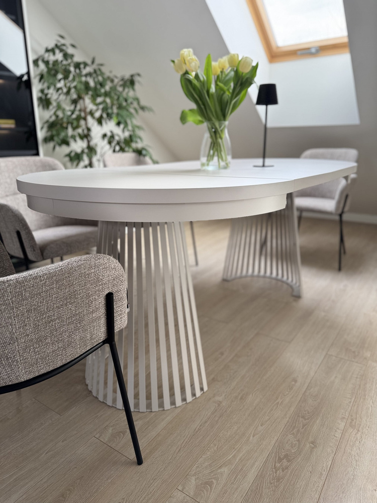 Det vita matbordet är placerat på ett metallben med en unik design. På avstånd påminner underredet om de lister som för närvarande är en hit i inredningar. Kombinationen av metall och en bordsskiva i massivt laminat har skapat en möbel som sticker ut i rummet. Den här mångsidiga möbeln är perfekt för många designstilar - från minimalistisk till industriell. Den massiva bordsskivan i kombination med det moderna metallunderredet skapar en elegant kombination som kan bli mittpunkten i ett utrymme. En särskild styrka hos bordet är dess utomordentliga stabilitet. Det övergripande utseendet är mycket stilfullt och elegant.