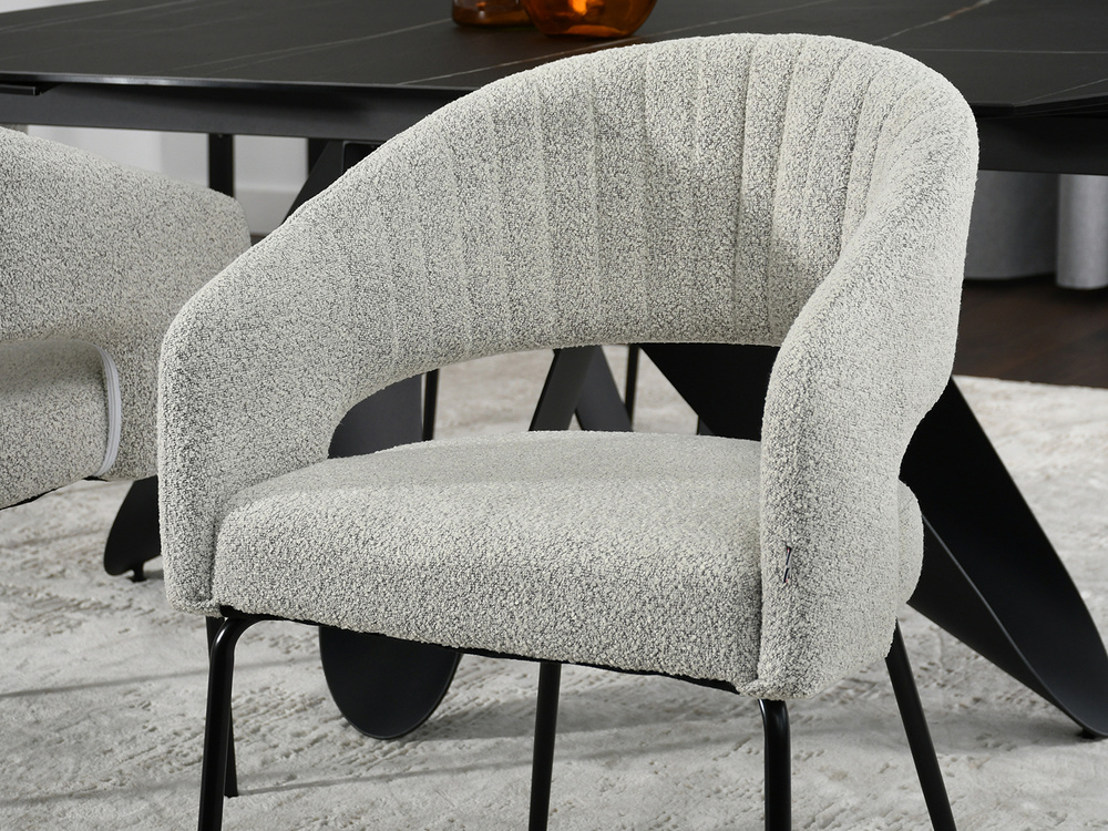 Stol boucle beige svart ben KALI är den perfekta kombinationen av modern design och funktionalitet och passar perfekt in i alla inredningar. Tack vare användningen av högkvalitativa material som t.ex boucle-tyg i stoppningsskum, stolen ger inte bara enastående komfort utan också hållbarhet i många år framöver.