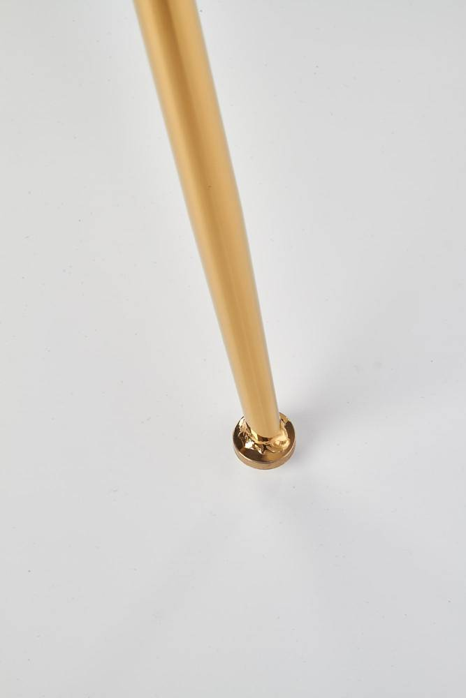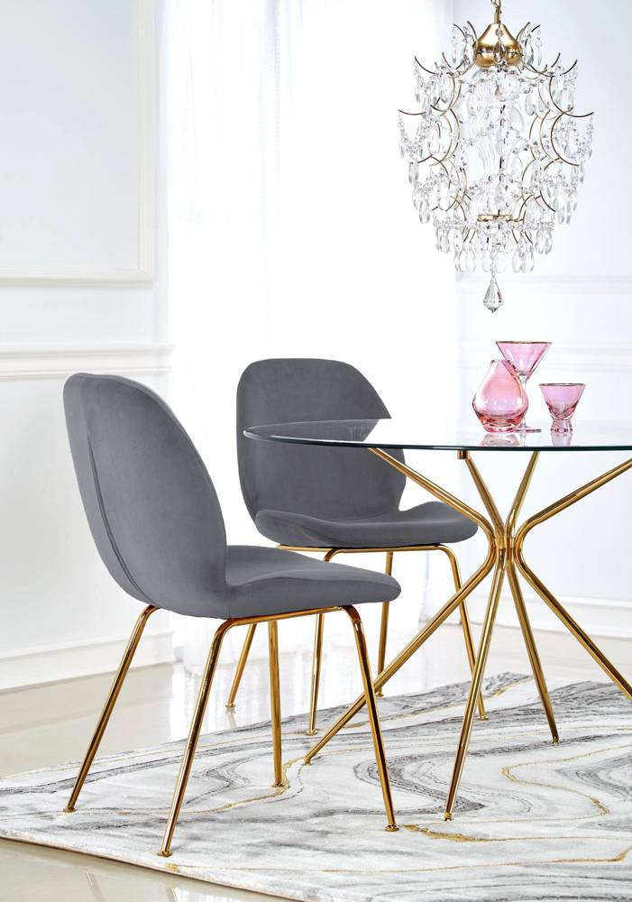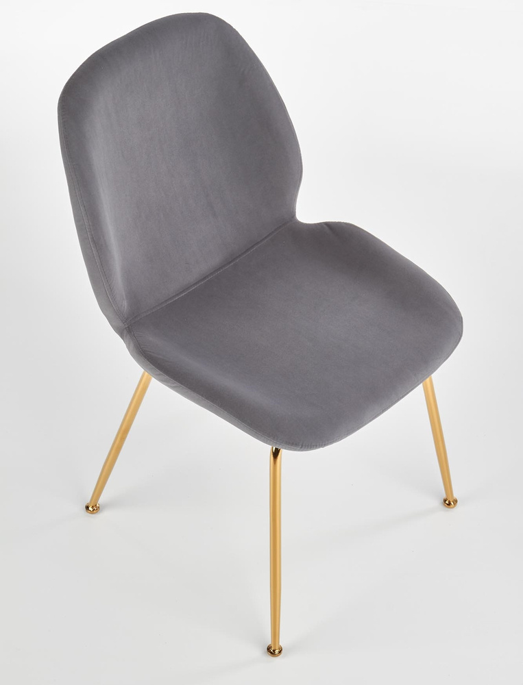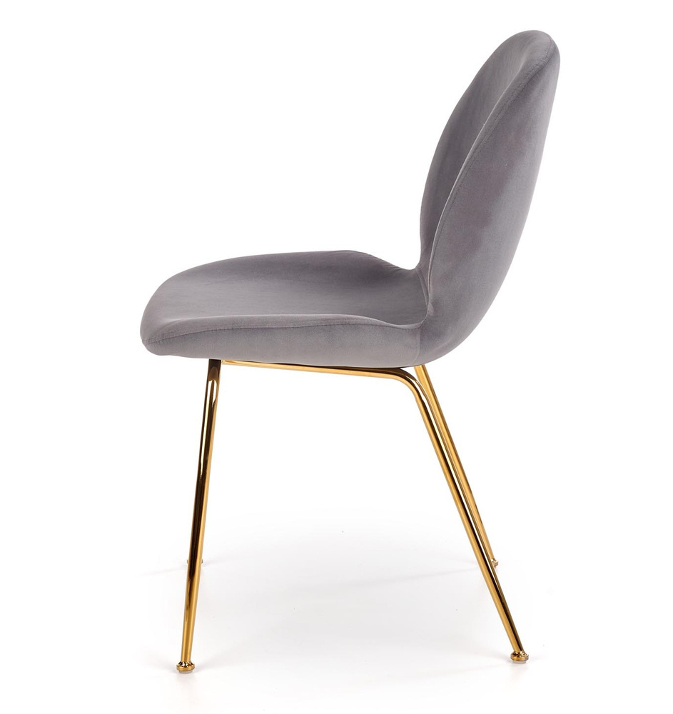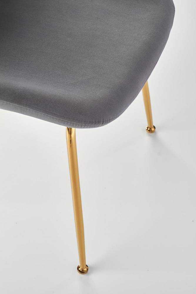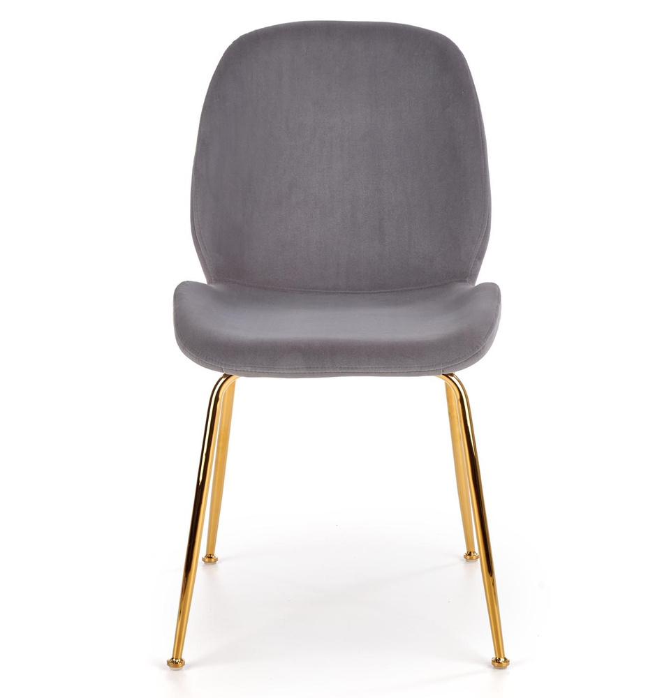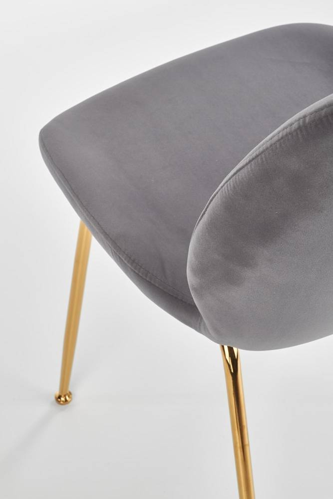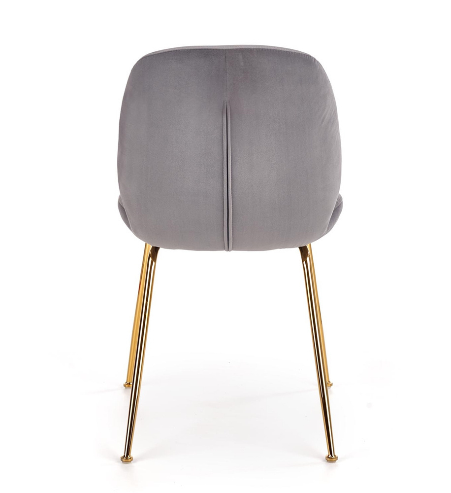Materialet är inte bara behagligt att ta på, utan ser också vackert ut. Strukturen på denna grå stoppade stol vilar på gyllene metallben som håller dig säker när du använder stolen. Du vill placera produkten runt ditt favoritbord i en modern eller glamorös inredning. Den grå stoppade stolen K381 är en stilren möbel som kommer att bli en unik dekoration av matsalen eller vardagsrummet. Den trivs med sin vackra form och färgkombination av grått och guld.
