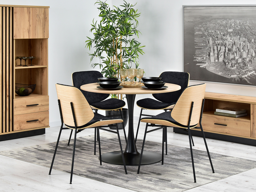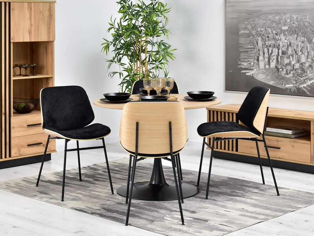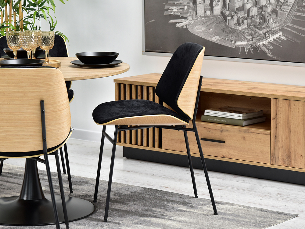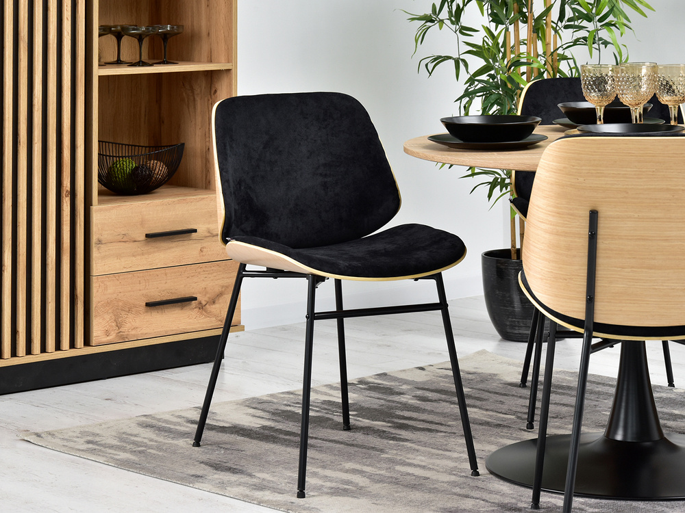 Den moderna stolen JORDI är den perfekta kombinationen av stil och funktionalitet som passar perfekt in i alla inredningar. Tack till svarta ben och sits i svart/naturlig ek, denna stol är ett elegant tillskott till ditt hem eller kontor. Dess industriella i modern stil gör den till en mångsidig möbel som lätt passar in i en mängd olika miljöer.