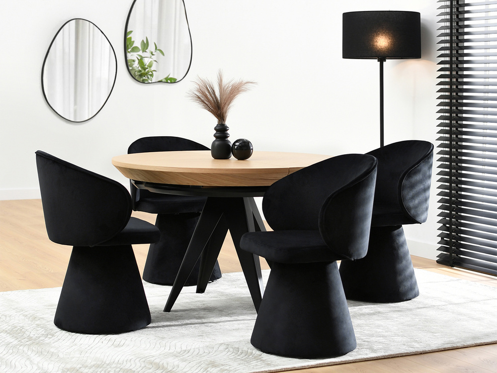 SOLEA-stolen är klädd i ett mjukt velourtyg i en djup svart nyans, vilket ger den en lyxig känsla. Ett annat unikt element är velourunderredet, som på ett harmoniskt sätt kompletterar helheten och ger stolen en unik stil. Den vridbara funktionen gör den inte bara vacker utan också bekväm att använda i vardagen.