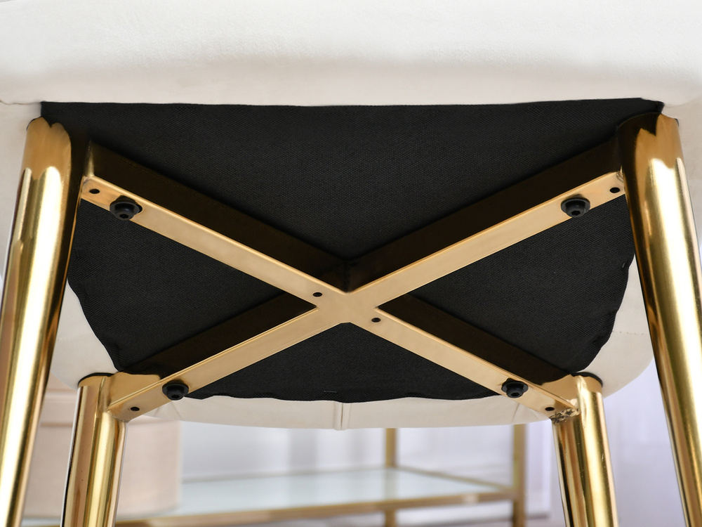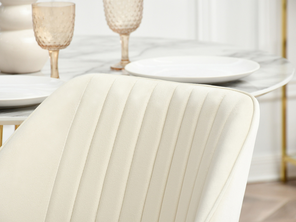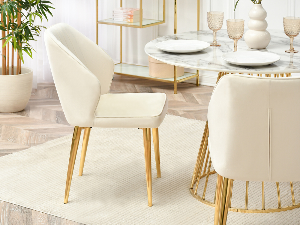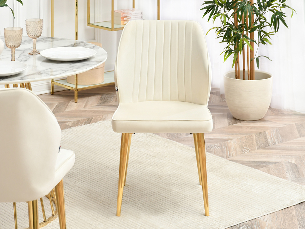 Den krämfärgade velourstolen GASPAR med gyllene ben är den perfekta kombinationen av elegans och funktionalitet, som passar perfekt in i samtida, moderna och glamourösa stilen. Denna unika stol har utformats för personer som inte bara värdesätter estetik utan även komfort. Tack vare sin mångsidighet fungerar GASPAR-stolen bra i en mängd olika utrymmen, t.ex kontor, affärslokaler, barnrum, arbetsrum i hemmet, matsal eller vardagsrum.