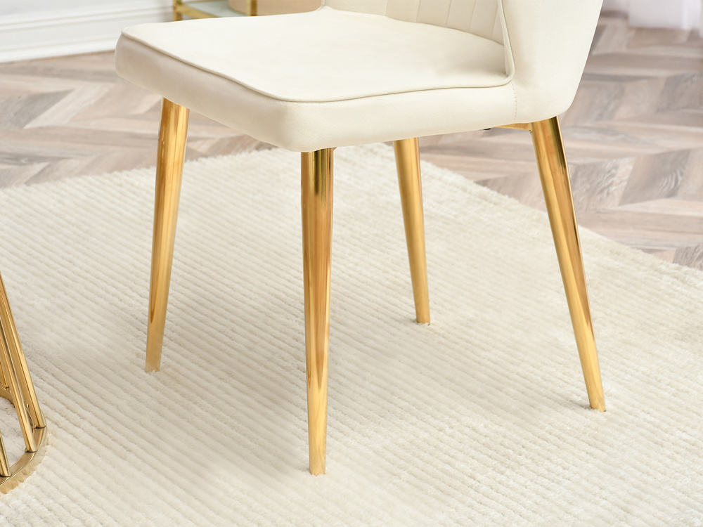Genom att välja GASPAR stol i krämfärgad velour med guldben investerar du i en möbel som kombinerar modern design med funktionalitet. Det är ett utmärkt val för dem som vill