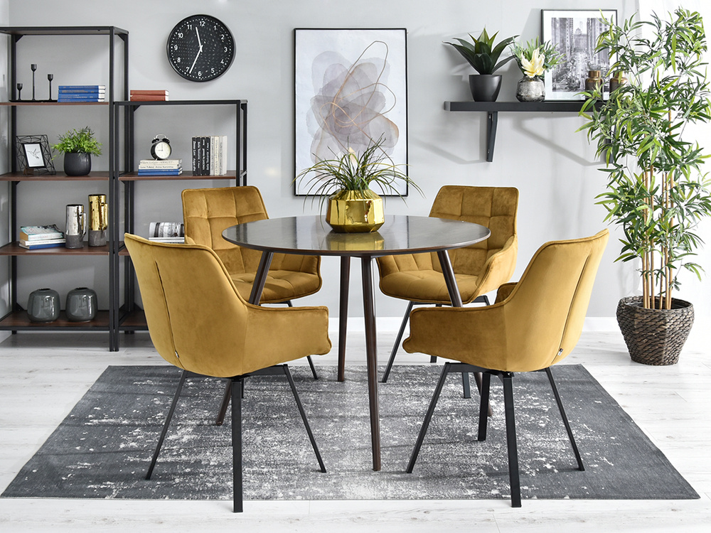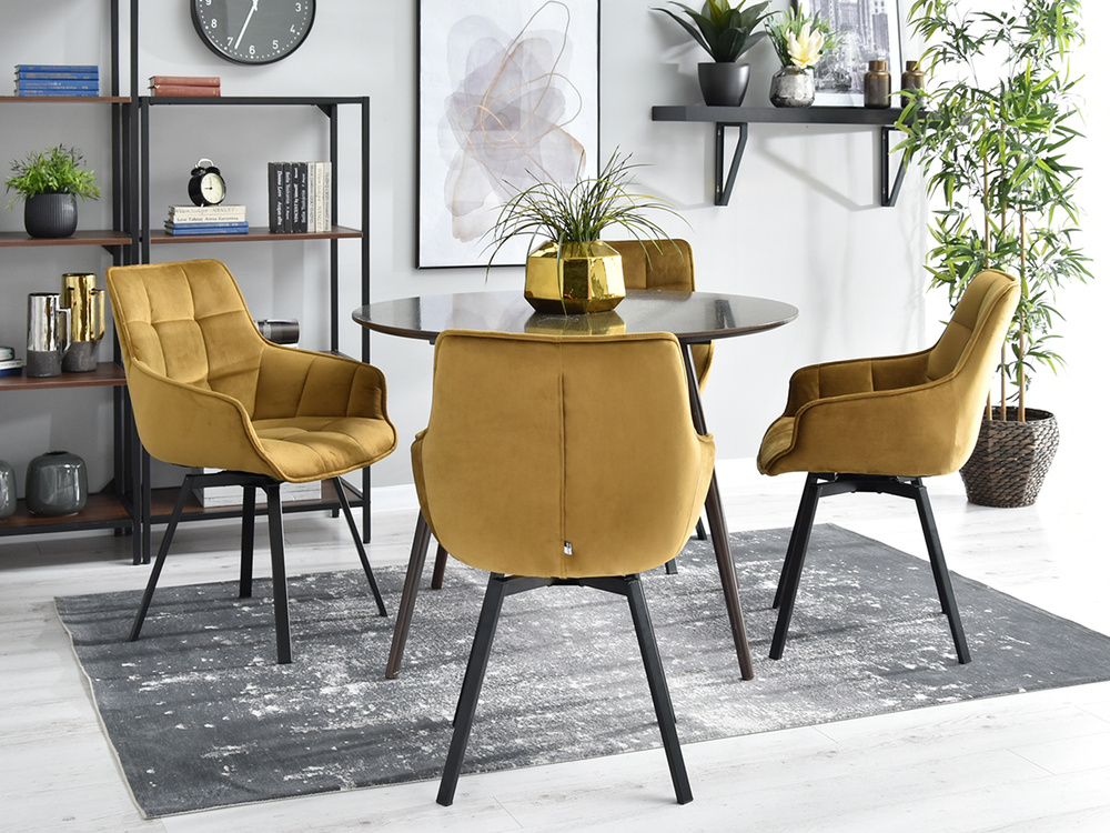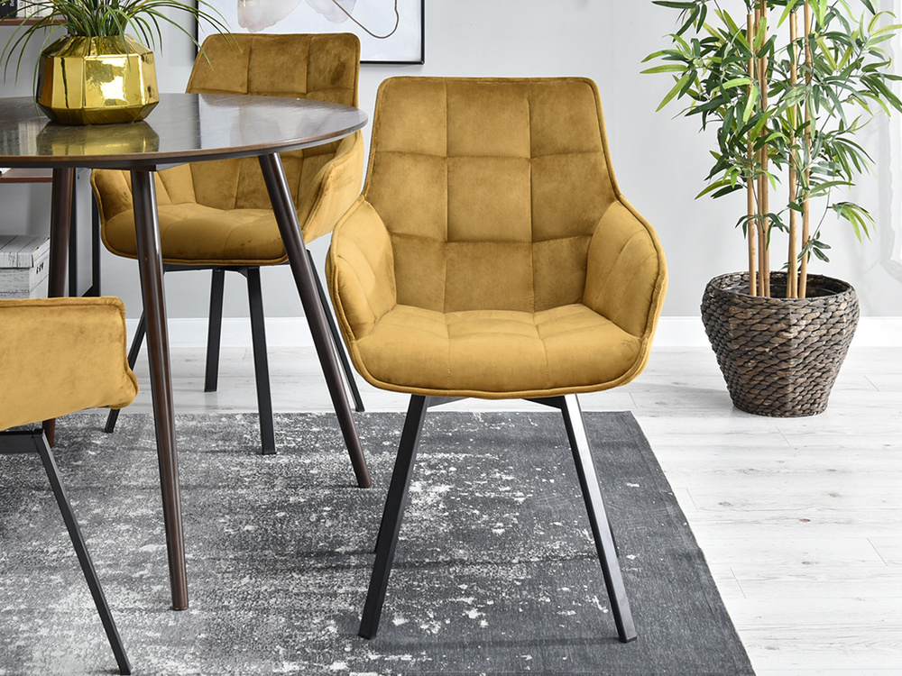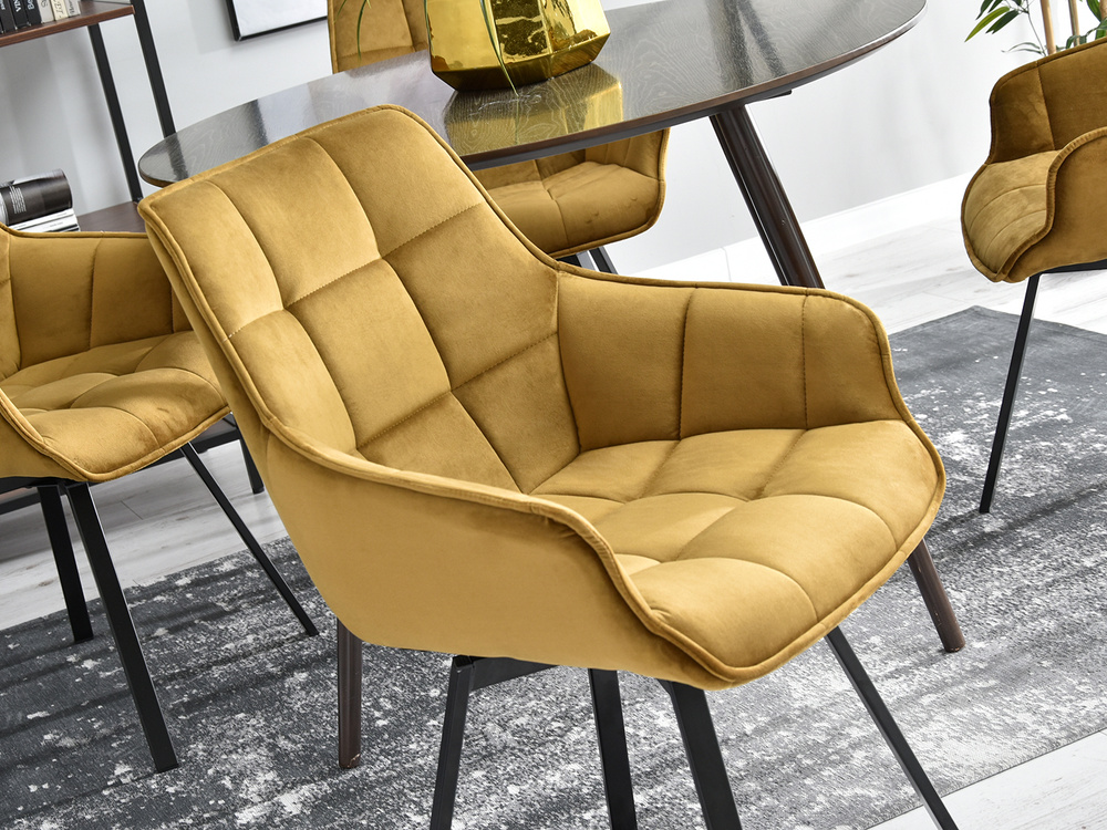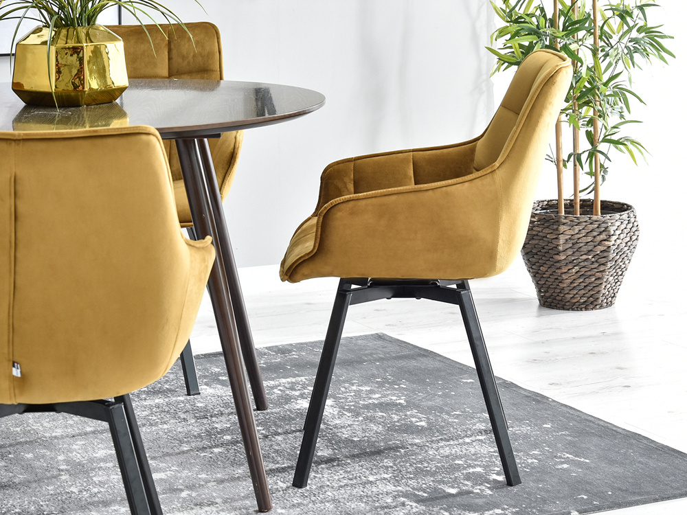 Stol i velour ARUBA är den perfekta kombinationen av elegans och funktionalitet som passar perfekt in i moderna interiörer. Tack vare sin glamour stil blir denna stol inte bara en praktisk möbel utan också en dekoration för alla rum. Dess gyllene säte kombinerat med svarta ben skapar en harmonisk komposition som fångar ögat och ger en lyxig touch till inredningen.