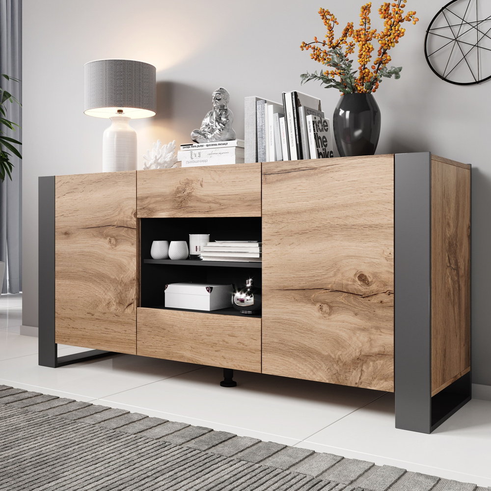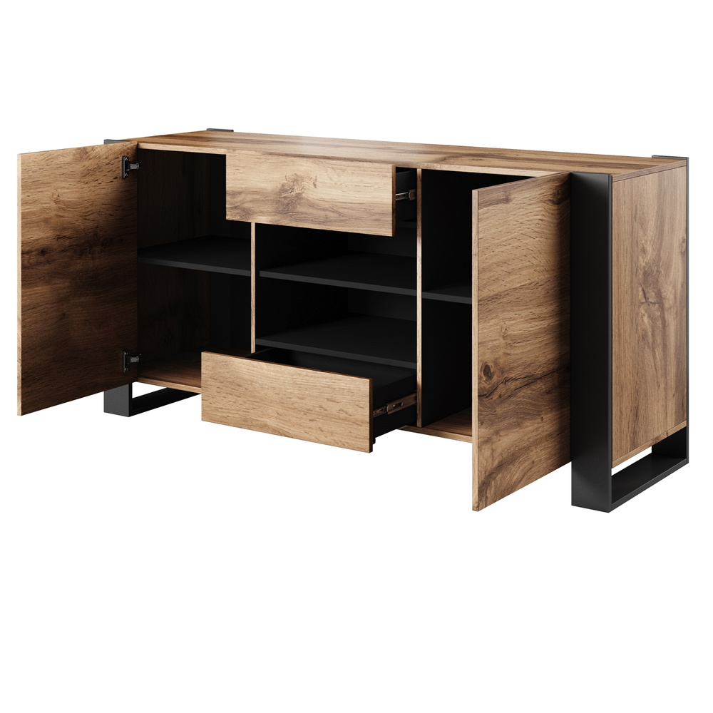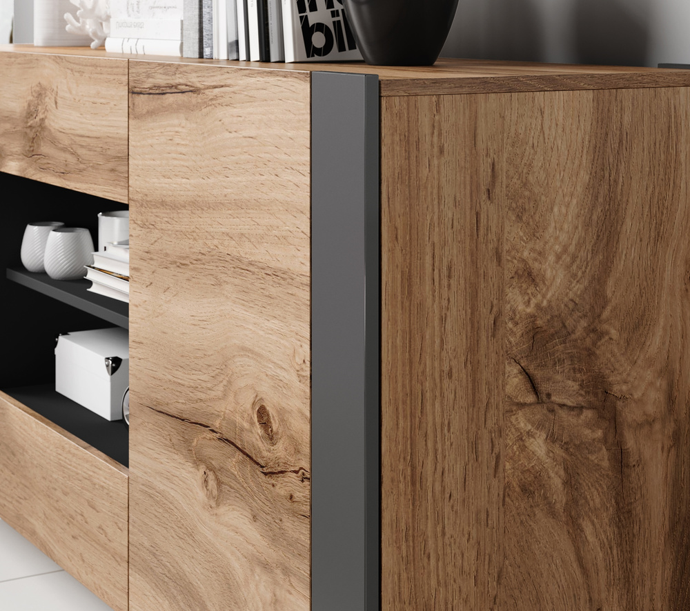 WOOD byrå har två breda hyllor som enkelt passar, t.ex. en digitalbox, favorit-CD-skivor eller böcker som