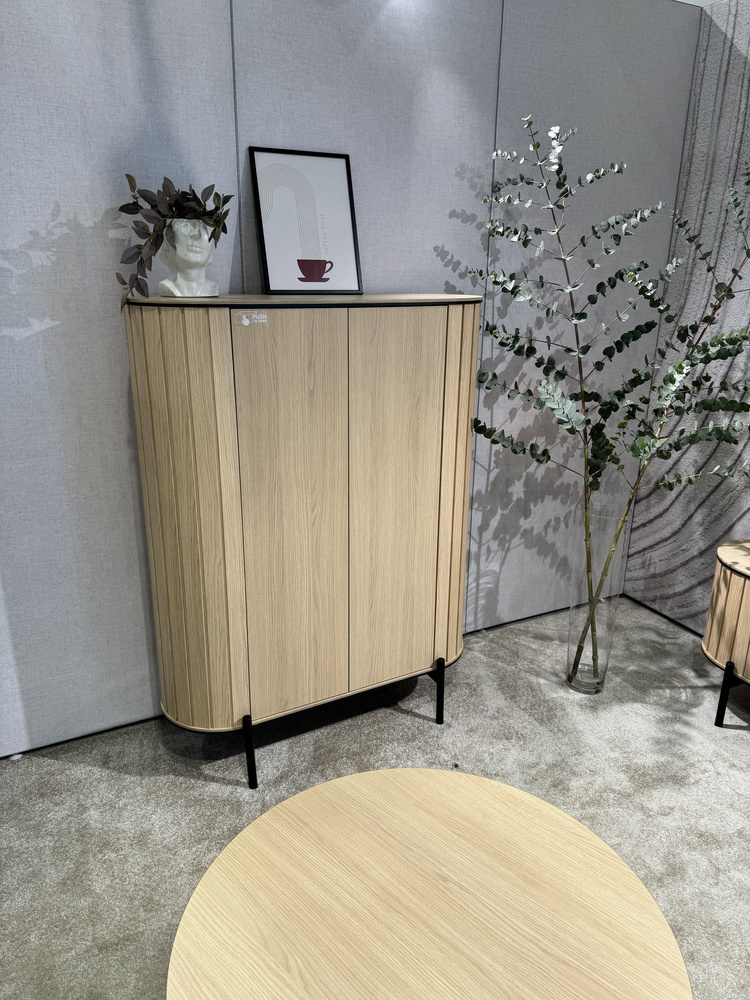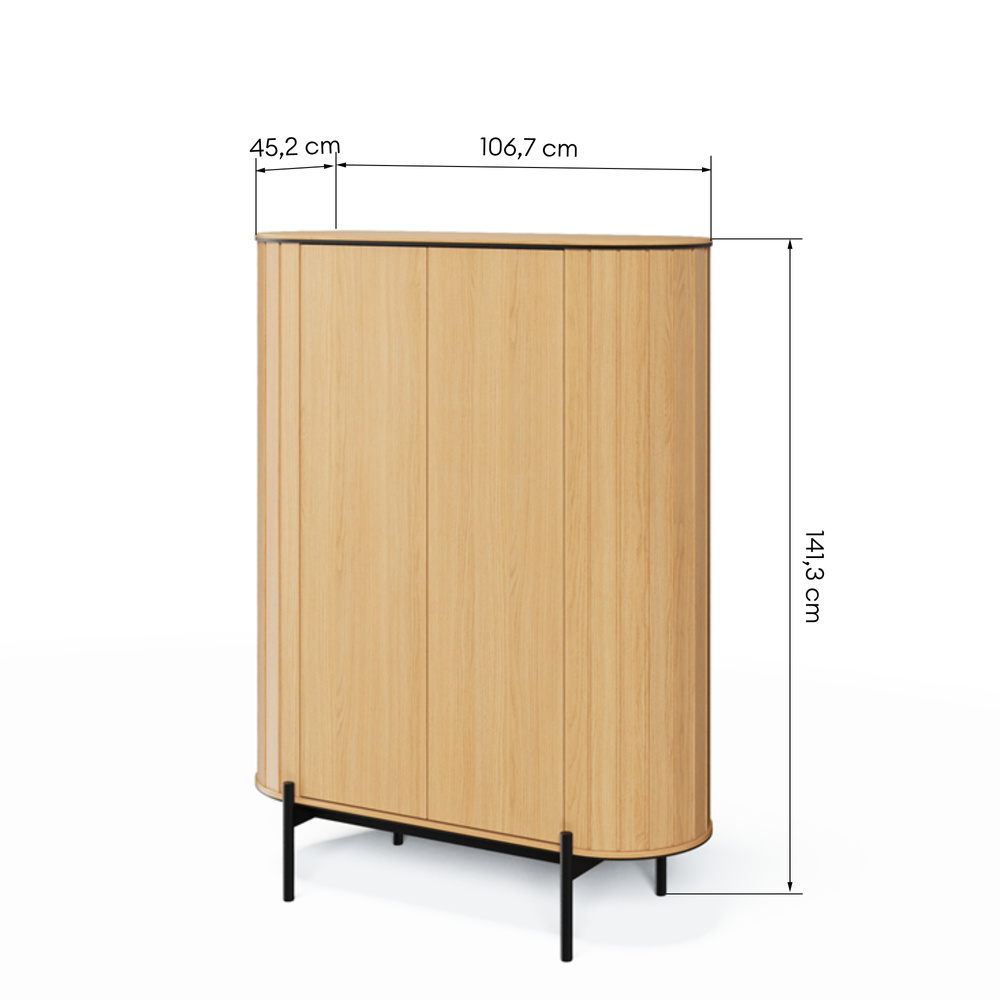 Kommoden kännetecknas av sina rundade kanter och sin eleganta vertikala silhuett, som ger lätthet och harmoni till utrymmet. Den unika designen gör den till vardagsrummets blickfång.