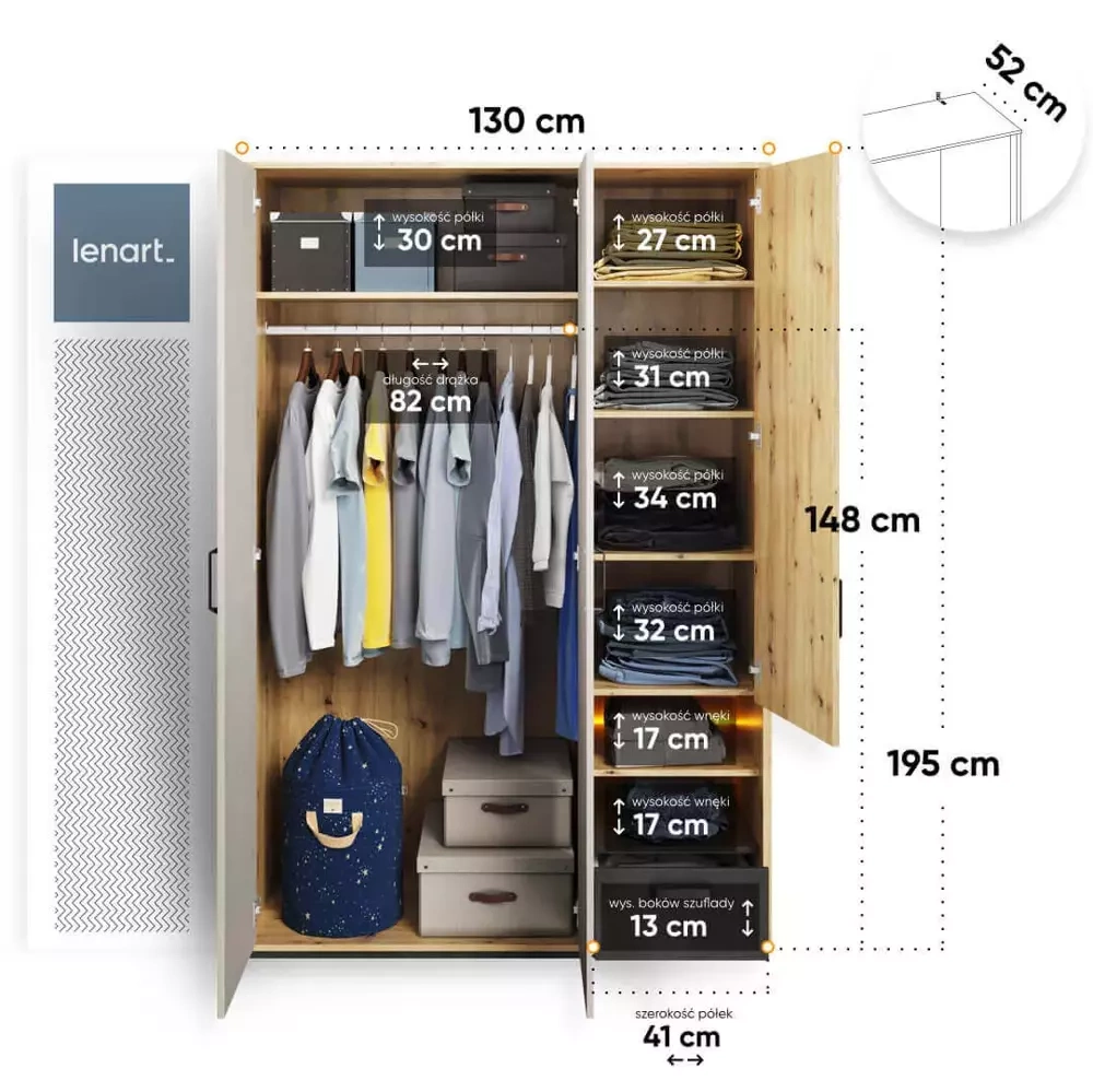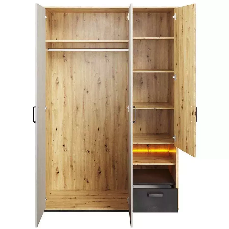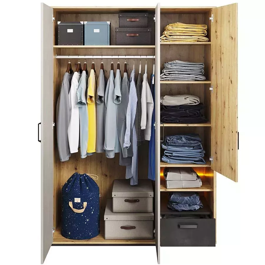 Dörrgarderoben QUBIC har en modern, geometrisk form - fronter gömda under kroppen och tre färger - subtilt grått och trä i kombination med råstål. Garderobens moderna karaktär betonas också av metallhandtag och små stöd. Satsen innehåller LED-belysning. Möblerna är gjorda av en slitstark laminerad platta, tillverkade med en slitstark ABS-kant, vilket garanterar hållbarhet under många års användning! För att skapa lag och ordning i ungdomsrummet välj QUBIC garderober!
