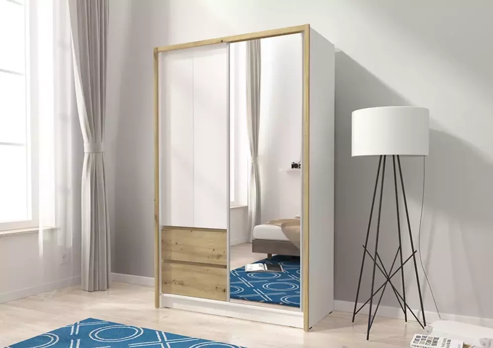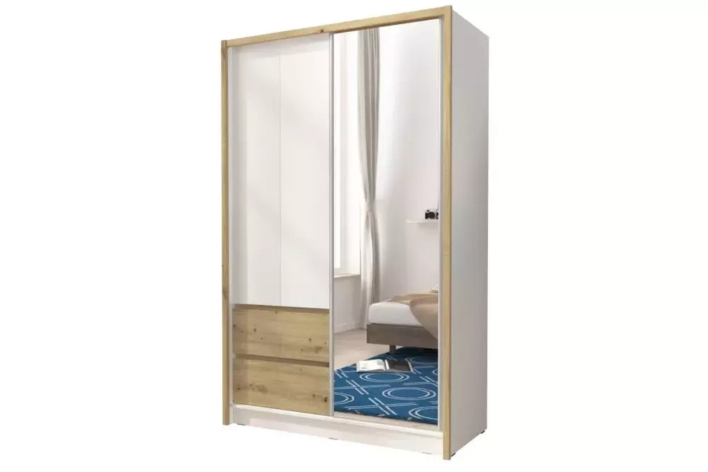 SARA sovrumsgarderob är den perfekta lösningen för människor som värdesätter enkelhet och elegans. SARA skjutgarderob är perfekt för att förvara en mängd olika kläder, inklusive de som behöver hängas. Inredningen i garderoben är uppdelad i två olika zoner: den första består av rymliga hyllor och två djupa lådor. Den andra zonen består av den rymliga fördjupningen med klädstång och en hylla. Tack vare detta kommer även den minsta sak att hitta sin plats här, och du kommer att glömma det långa sökandet efter din favoritblus eller en handväska som matchar din outfit. En annan fördel med denna garderob är en stor spegel där du enkelt kan se dig själv innan du går till jobbet. Garderob med en stor spegel kommer att lysa upp rummet och förstora det optiskt.
