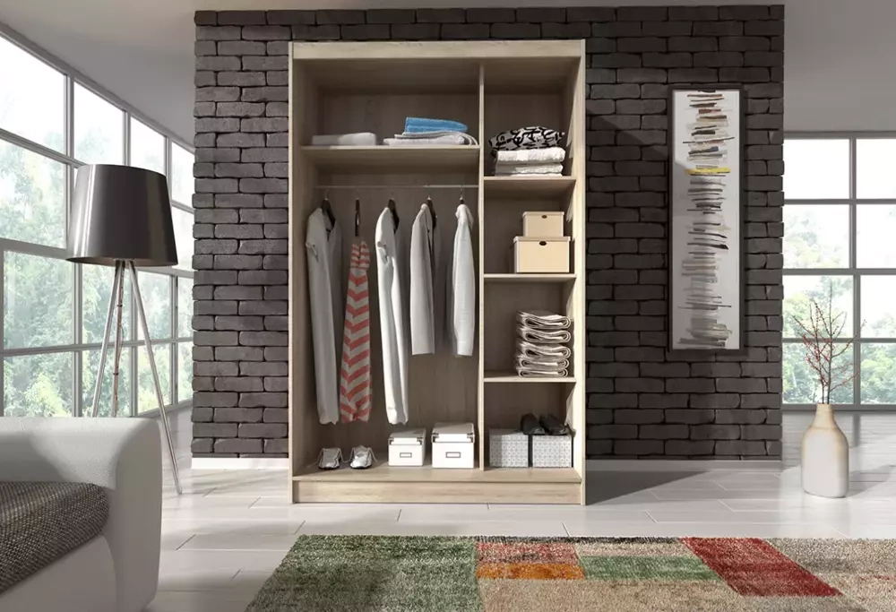 Denna garderob kommer att vara en perfekt möbel till ett modernt hem. Garderoben är väldigt rymlig. Garderoben är tillverkad av laminerade skivor och ABS-kanter som garanterar hållbarhet.