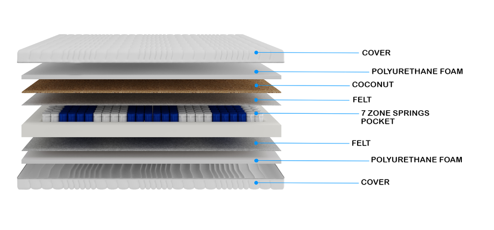7-zon POCKET SPRINGS - fjädersystem som delar hela madrassytan i 7 zoner. Försäkrar användarens komfort. Rekommenderas särskilt till dubbelsänga, för den dämpar andra personens rörelser. Anpassar sig till kroppens vikt.