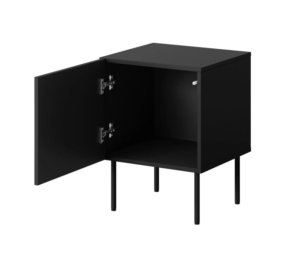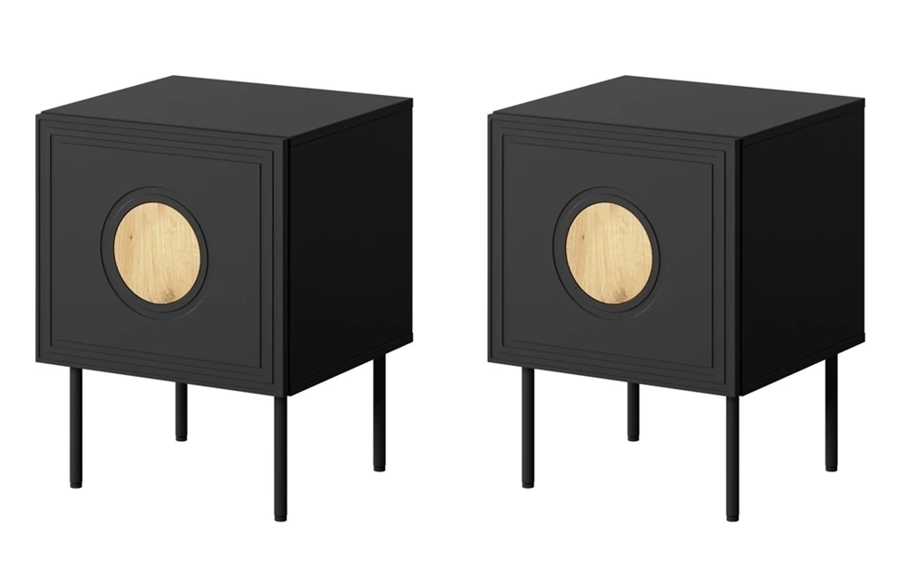 PALAZZO sängbord kommer att vara perfekt för en modern inredning. Deras designerlook kommer att ge klass och elegans till din interiör. Sängborden har en dekorativ front, bakom vilken det finns en rymlig hylla där du kan förvara det praktiska du skulle vilja ha nära sängen. Du kan visa vackra dekorationer, bilder eller en funktionell nattlampa på bordsskivan. Skåpen har inga handtag - de har ett tryck för att öppna öppningssystem. En vacker accent är runda ekinsatser på fronterna, som ger möblerna elegans. De svarta metallbenen, som är tillräckligt höga för att göra det lättare att hålla ordning under möblerna, tillför subtilitet och stabilitet till skåpet. Skåpskroppen är gjord av 16 mm matt laminerad skiva, och insatsen är gjord av MDF-skiva och PVC-folie.