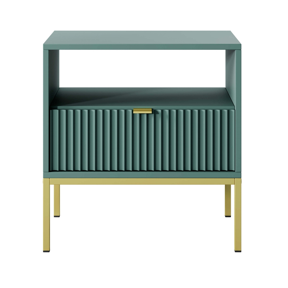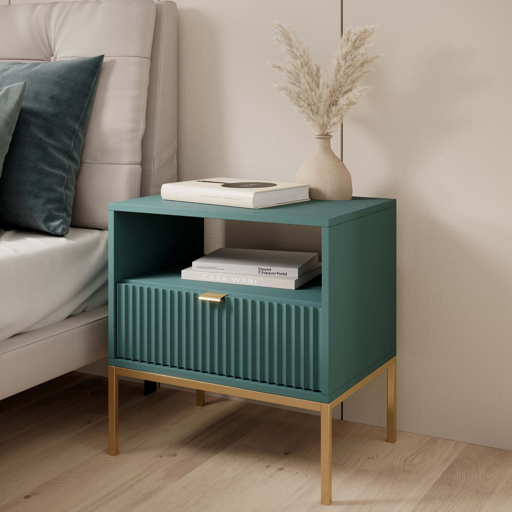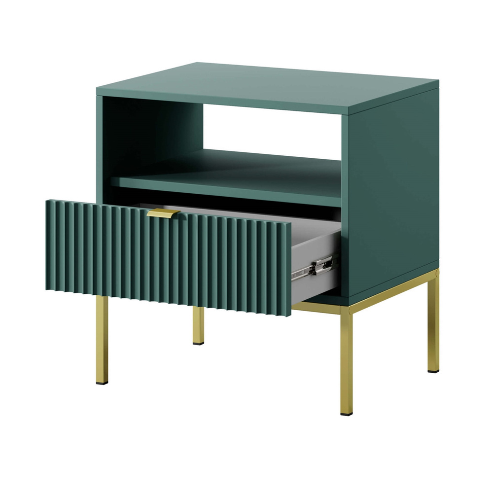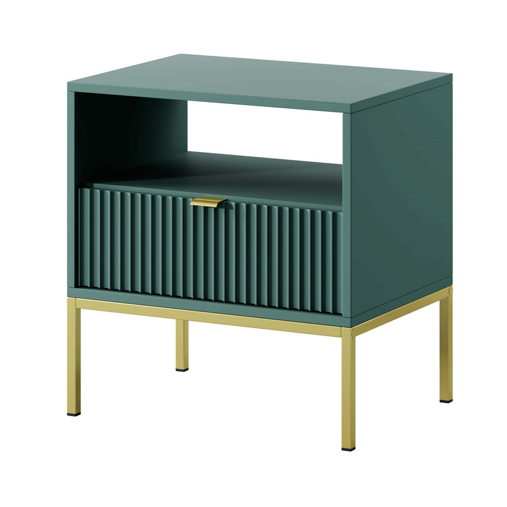 Litet sängbord VOLARE är inte bara tilltalande för ögat, utan också mycket praktiskt - det kan förvara din favoritbok, placera en nattlampa på den eller lägga undan din telefon. Skåpet är utrustat med en rymlig låda där du enkelt kan förvara småsaker, som smycken eller kosmetika som du använder innan du går och lägger dig. Den stabila strukturen garanteras av smala, pulverlackerade metallben, som tillför elegans till helheten. Designen på Volare sängbord kommer säkerligen att glädja ditt öga. Kroppen är gjord av massiv MDF, så möbeln kommer att tjäna dig i många år. Om du värdesätter minimalism och funktionalitet framför allt inom möbler, kommer vår Volare möbelkollektion att vara ett förslag som du definitivt inte kommer att gå förbi likgiltigt! Sängbordet imponerar med sin vackra, eleganta nyans av flaskgrönt och dekorativ front. Volare-kollektionen är helt annorlunda än de tidigare du kanske har sett på vår hemsida. Den designades för att passa dagens trender - höga, gyllene ben, geometrisk form och färg framhäver elegans och modern stil. Det minimalistiska gyllene handtaget ger möblerna extra värde och ökar inredningens prestige. Detta är modulära möbler, så de kan kombineras fritt. Det finns inget enkelt mönster för dessa möbler - de passar var du än ser dem.