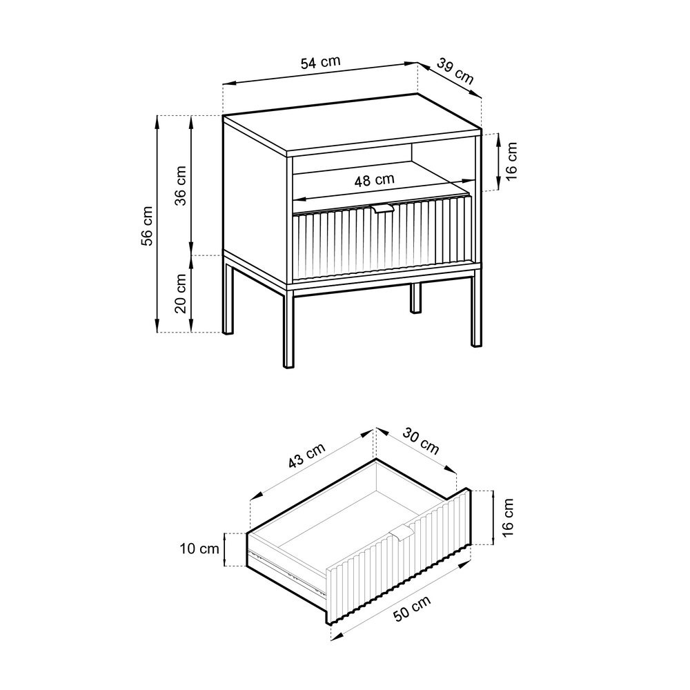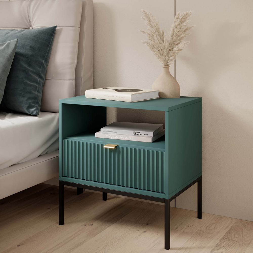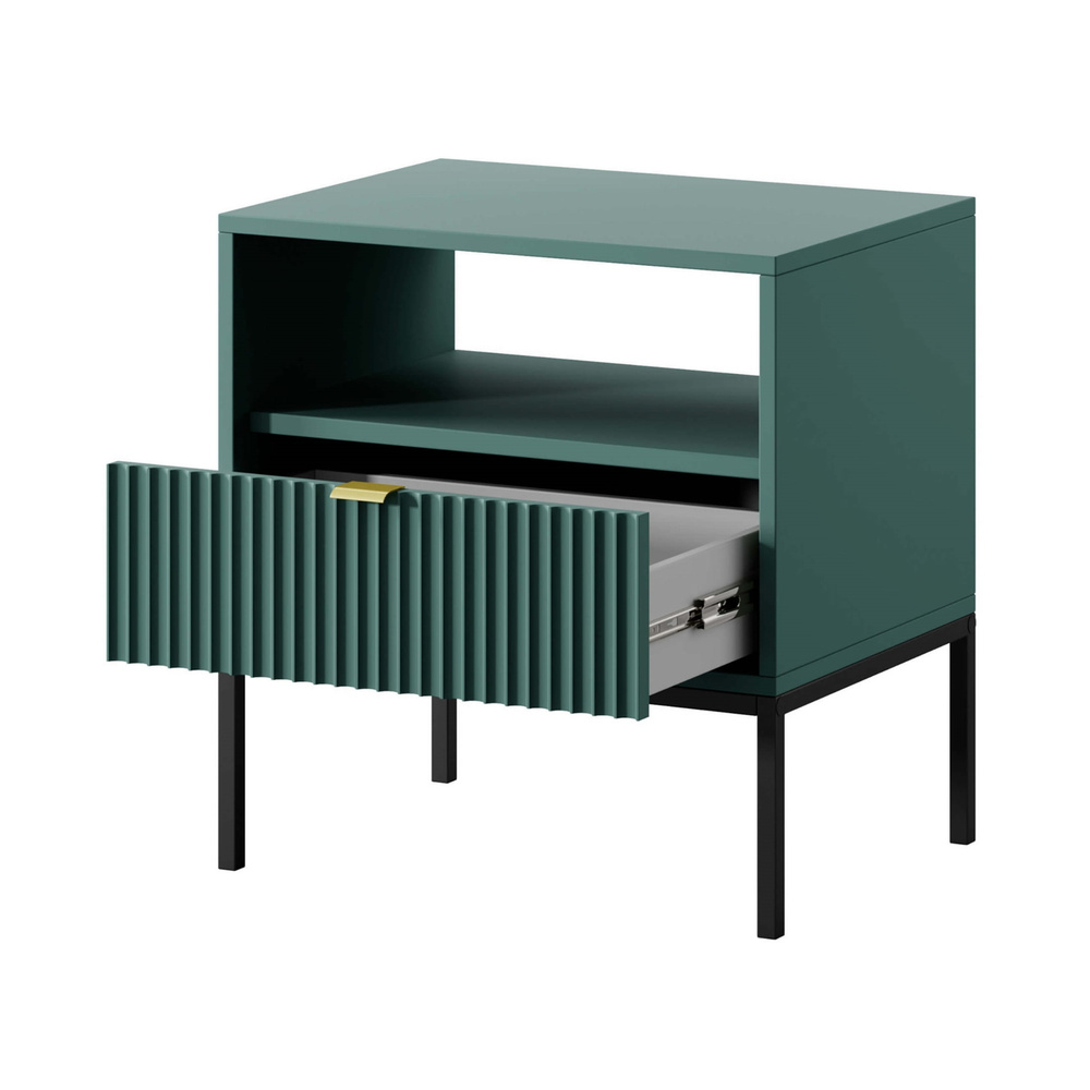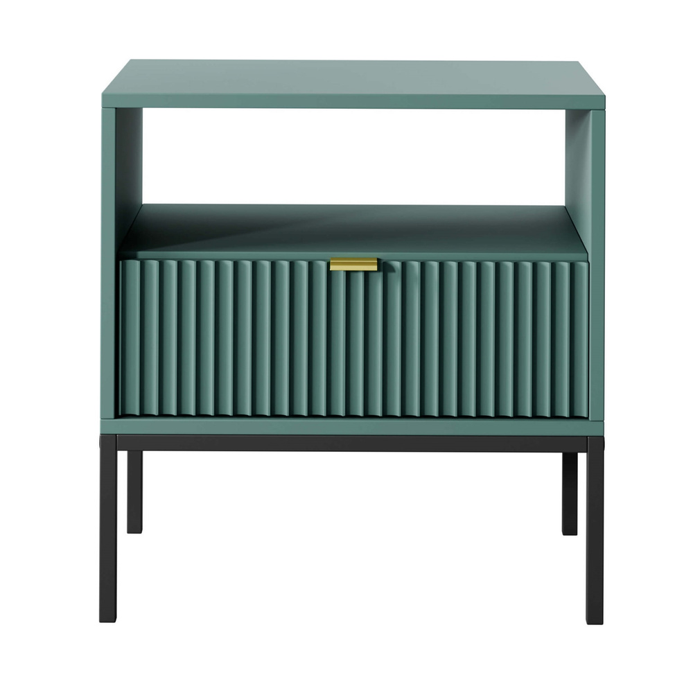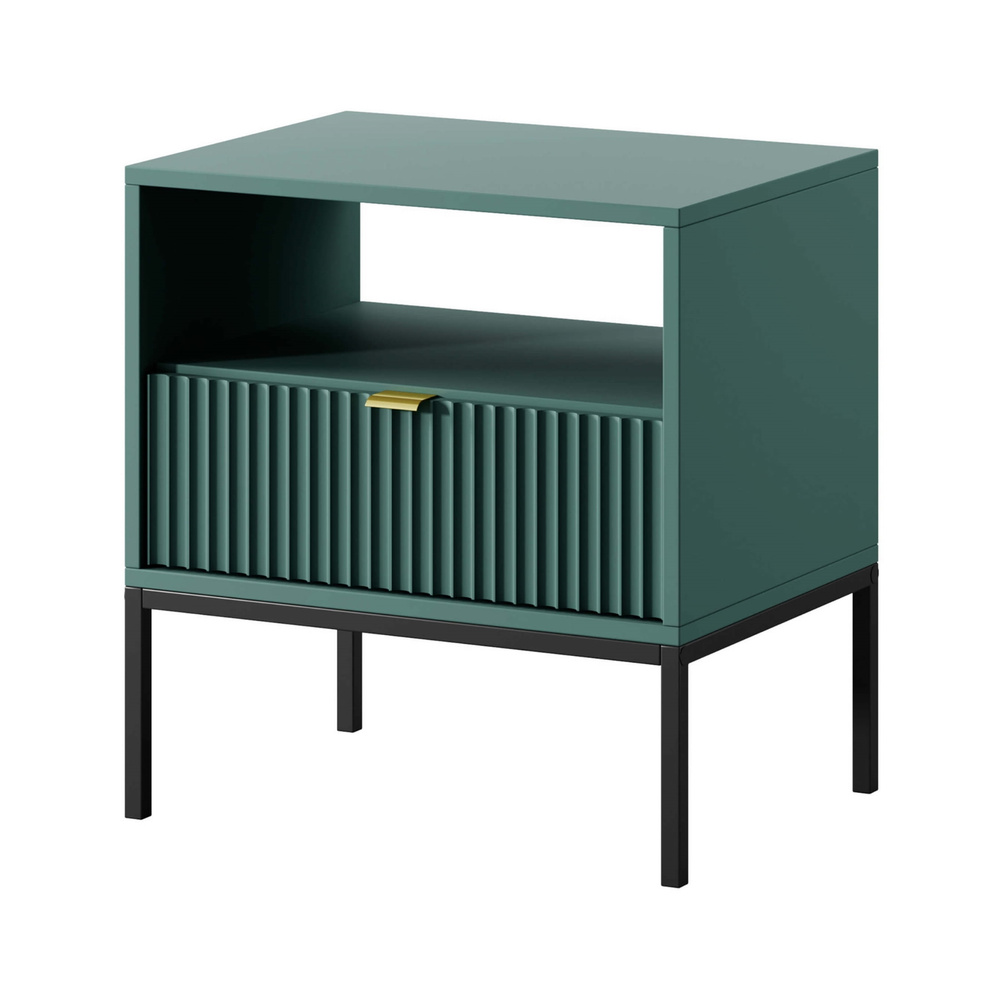 Litet sängbord VOLARE är inte bara tilltalande för ögat, utan också mycket praktiskt - det kan förvara din favoritbok, placera en nattlampa på den eller lägga undan din telefon. Skåpet är utrustat med en rymlig låda där du enkelt kan förvara småsaker, som smycken eller kosmetika som du använder innan du går och lägger dig. Den stabila strukturen garanteras av smala, pulverlackerade metallben, som tillför elegans till helheten. Designen på Volare sängbord kommer säkerligen att glädja ditt öga. Kroppen är gjord av massiv MDF, så möbeln kommer att tjäna dig i många år. Om du värdesätter minimalism och funktionalitet framför allt inom möbler, kommer vår Volare möbelkollektion att vara ett förslag som du definitivt inte kommer att gå förbi likgiltigt! Sängbordet imponerar med sin vackra, eleganta nyans av flaskgrönt och dekorativ front. Volare-kollektionen är helt annorlunda än de tidigare du kanske har sett på vår hemsida. Den designades för att passa dagens trender - höga, svarta ben, geometrisk form och färg framhäver elegans och modern stil. Det minimalistiska gyllene handtaget ger möblerna extra värde och ökar inredningens prestige. Detta är modulära möbler, så de kan kombineras fritt. Det finns inget enkelt mönster för dessa möbler - de passar var du än ser dem.