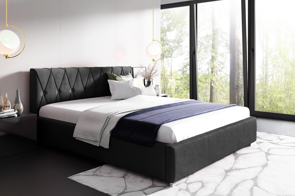 Stoppad säng MANGO är en mycket funktionell och modern möbel som passar alla interiörer. MANGO-sängen är en klassisk dubbelsäng med sänggavel. En enkel sänggavel är gjord av 3 cm tjockt skum, den har noggrant och estetiskt gjorda mönster som kommer att vara en snygg dekoration av hela rummet. Vadderade dekorativa stift användes vid skärningspunkten mellan linjerna. Sängen har en behållare för sängkläder, en metallram med 34 fjäderribbor och gaslyftar som underlättar lyft. Sängen är gjord av ett velourtyg som är lätt att rengöra. Rengör endast med milda möbelvårdsprodukter. Blek inte (klor). Stryk inte. Torktumla ej. Inte kemtvättas.