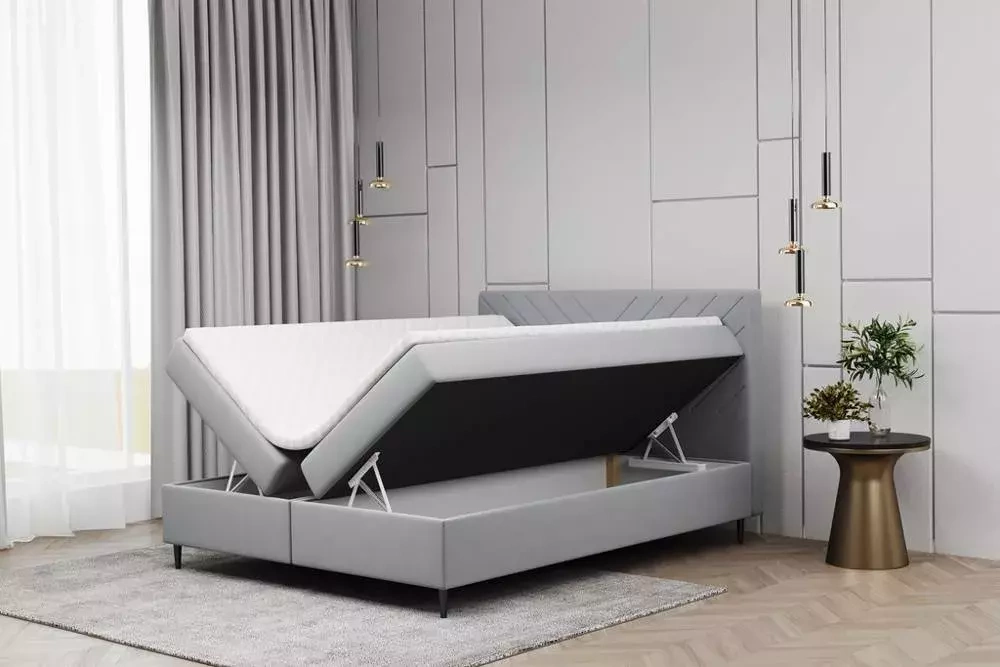 Förväntar du dig mer av dina möbler än bara ett snyggt utseende? Välj då den eleganta kontinentalsängen BALTIC, som mästerligt kombinerar funktionalitet med en vacker look! Boxfjäder BALTIC-sängen lockar din uppmärksamhet med en vadderad ram och en intressant sänggavel täckt med geometriska sömmar. BALTIC sovrumssäng har en lagerstruktur som är karakteristisk för kontinentalsängar. Möbeln har en stabil boxbotten på vilken en bonellmadrass placeras. Tack vare en speciell kombination av bonellfjädrar och T-30-skum kommer detta element att ge dig utmärkt mjukhet samtidigt som det ger tillräckligt stöd för nyckelpunkterna i ryggraden. Det hela avslutas med en behaglig ytmadrass gjord av T-25-skum, som inte bara ger extra komfort, utan också skyddar möblerna från smuts. Höga, 13 cm, metallben ger lätthet och elegans. Dessutom ger denna modell en plats för bekväm förvaring av sängkläder, eftersom den döljer två stora behållare.