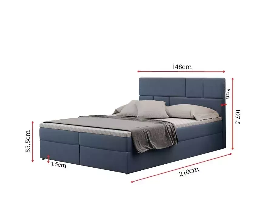 Drömmer du om ett bekvämt och stilrent sovrum? BERLIN Continental Bed hjälper dig att nå detta mål! BERLIN resårmadrass är ett förslag gjort för dig som vill kombinera funktionalitet med högsta komfort i sovrummet. Den stoppade sänggaveln är dekorerad med intressanta sömmar i geometriska former. BERLIN sovrumssäng har en lagerstruktur som är karakteristisk för kontinentalsängar. Möbeln har en stabil boxbotten på vilken en bonellmadrass placeras. Tack vare en speciell kombination av bonellfjädrar och T-30-skum kommer detta element att ge dig utmärkt mjukhet samtidigt som det ger tillräckligt stöd för nyckelpunkterna i ryggraden. Det hela avslutas med en behaglig ytmadrass gjord av T-25-skum, som inte bara ger extra komfort, utan också skyddar möblerna från smuts. Dessutom ger denna modell en plats för bekväm förvaring av sängkläder, men också nödvändiga kläder eller tillbehör, tack vare att den är utrustad med två stora bröstbehållare gömda inuti sängen.