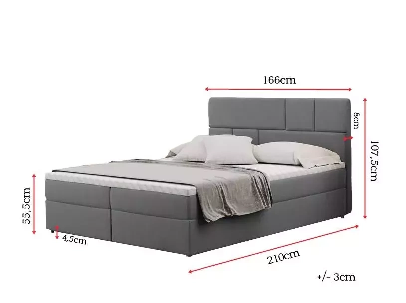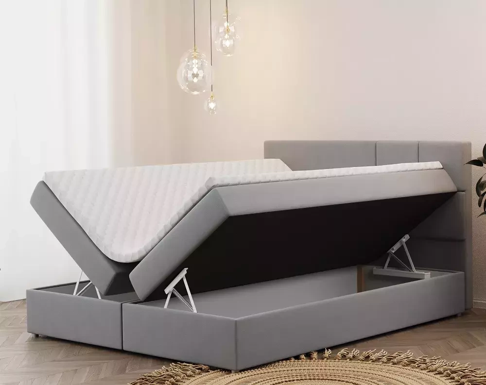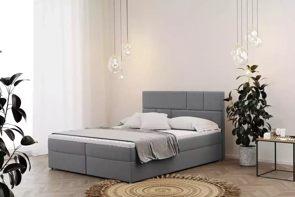 Drömmer du om ett bekvämt och stilrent sovrum? BERLIN Continental Bed hjälper dig att nå detta mål! BERLIN resårmadrass är ett förslag gjort för dig som vill kombinera funktionalitet med högsta komfort i sovrummet. Den stoppade sänggaveln är dekorerad med intressanta sömmar i geometriska former. BERLIN sovrumssäng har en lagerstruktur som är karakteristisk för kontinentalsängar. Möbeln har en stabil boxbotten på vilken en bonellmadrass placeras. Tack vare en speciell kombination av bonellfjädrar och T-30-skum kommer detta element att ge dig utmärkt mjukhet samtidigt som det ger tillräckligt stöd för nyckelpunkterna i ryggraden. Det hela avslutas med en behaglig ytmadrass gjord av T-25-skum, som inte bara ger extra komfort, utan också skyddar möblerna från smuts. Dessutom ger denna modell en plats för bekväm förvaring av sängkläder, men också nödvändiga kläder eller tillbehör, tack vare att den är utrustad med två stora bröstbehållare gömda inuti sängen.