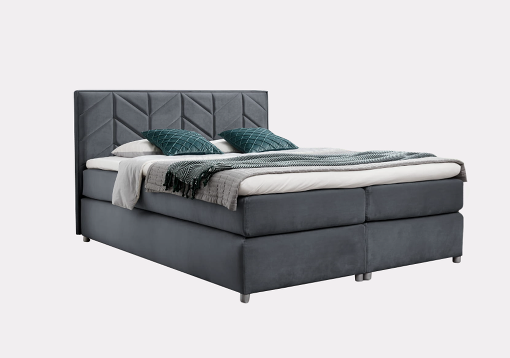SERINA är en säng i modern form som fungerar i alla moderna interiörer. Den vadderade kroppen täckt med ett mjukt velourtyg ser vackert ut och kommer att skapa en varm och mysig atmosfär i ditt sovrum. Den höga sänggaveln är dekorerad med geometriska sömmar som effektivt kommer att fånga ögat och glädja alla hushållsmedlemmar och gäster. SERINA sovrumssäng har en skiktad struktur som är karakteristisk för kontinentalsängar. Möbler har en stabil lådbotten med fickmadrass. Toppmadrassen består av högelastiskt skum som reglerar temperaturen och reagerar på minsta rörelse. Den ger också extra elasticitet och mjukhet, tack vare vilken den garanterar en lugn och behaglig sömn. Sängen är idealisk för par, för tack vare denna konstruktion stör rörelsen hos en person inte den andras sömn. Det hela bygger på smala ben i silverfärg.